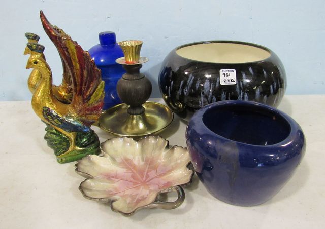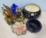 Colonial Style Candleholder, Blue Glass Jar, Pottery Bowl, Paper Mache Birds, HiMark Planter, Jameson Capistrano California Leaf Pottery Candy Dish. Colonial Style Candleholder, Blue Glass Jar, Pottery Bowl, Paper Mache Birds, HiMark Planter, Jameson Capistrano California Leaf Pottery Candy Dish.