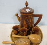 1023 Wood Carved Pitcher, Cups, and Maracas