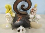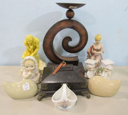 Metal Candle holder, wood jewelry box, precious moments, Lenwile China Harp Lady Music player, Lefton China Bady, two pottery glazed pieces. Metal Candle holder, wood jewelry box, precious moments, Lenwile China Harp Lady Music player, Lefton China Bady, two pottery glazed pieces.