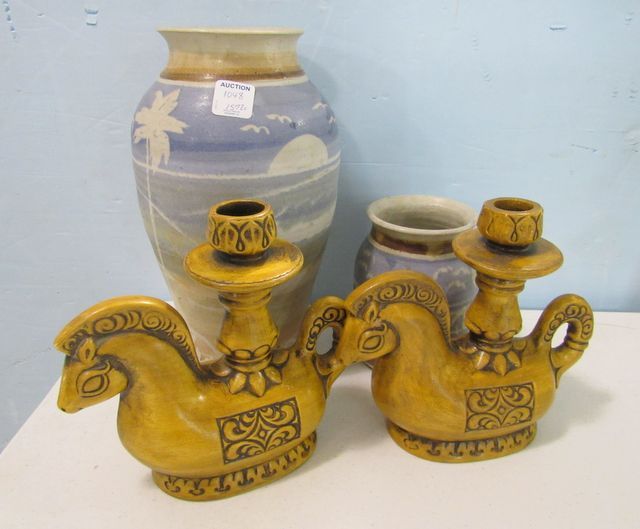 1048 Two Pottery Vases and Pair of Horse Candle Holders
