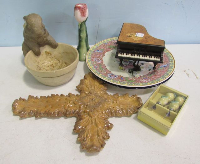 Pottery Rabbit bowl, Ceramic Cross, Ceramic Flower candle holder 8"h, Macau Chinese Plate, Provence Blue and white Plate, Reuge Music Fur Elise Piano Music Box Pottery Rabbit bowl, Ceramic Cross, Ceramic Flower candle holder 8"h, Macau Chinese Plate, Provence Blue and white Plate, Reuge Music Fur Elise Piano Music Box