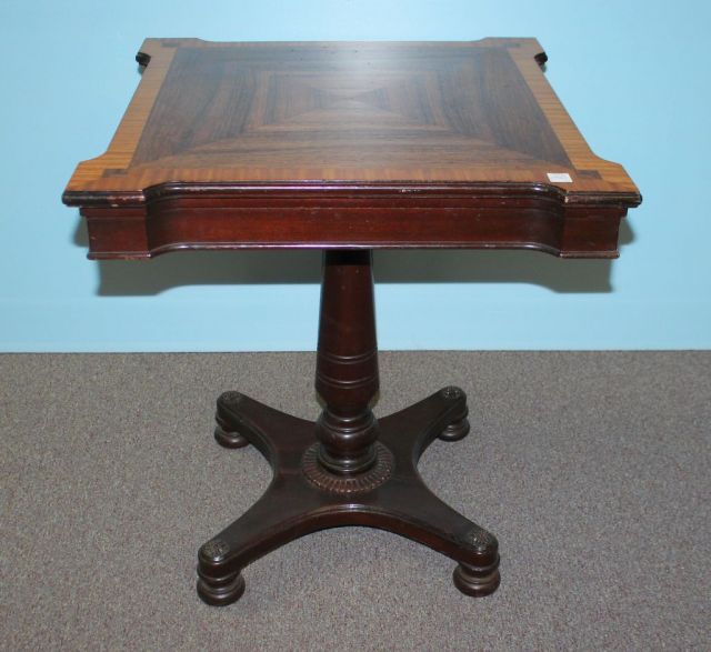 Mahogany, rosewood, and satinwood were favored. Inlay was used, some metal grillwork, and occasionally cane. Curves are rather bold, but simply so, and surfaces are flat with carvings including cornucopias, and floral designs.