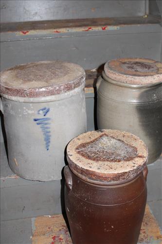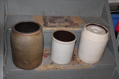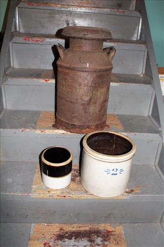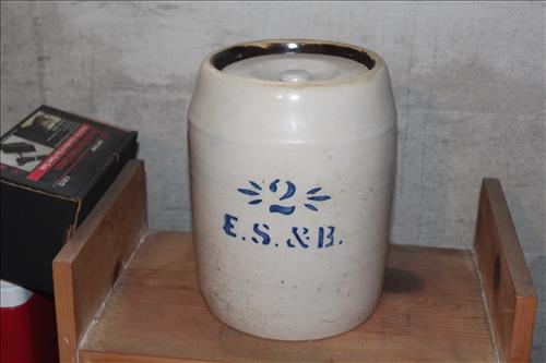 Antiques & Collectibles: 1904 P & S Mfg "Holds All" Wardrobe Trunk, Paddle Butter Churn, Many Crocks - Some w/Lids, Enamel Wash Bucket, J. C. Higgins & Coleman Coolers, Wringer Maytag Washer, Wolf's Head Adv Can, Torch, Early Wall Bell, Lantern, CB's & Antennas, Ringer Horse Shoes, Longaberger Basket, Wedgwood Jasper Glasses & Carrier & Plate; Oil Lamp, Carnival Glass Pitcher, Pink Depression, Ceramic Lighted & Musical Christmas Tree, Wendell August Forge: Vase, Pine Cone Coasters, Navy Dish, Air Force Ornament, Clock, Trivets, Photo Album, Bronze Cross & Pen Holder, GE Tray & More; Arthur Armour Items, GE Advertising: Train in Case, Pins, Tie Clasps, Key Chains, Watch, Clock & Pen Holder; Military Buttons, Sterling Silver Baby Bib Holder, Cross Pens, Remington Shaver, baby Shoes, MIB Colibri Pocket Watch w/Fob, Buck & Gerber Knives, Men's Watches: Seiko, Mickey Mouse & ETC; Lighters: Vulcan, Zippo, Colibri, Evans & Ronson; Military Hats, Army: Blanket, Pants & Undergarments; U.S. Air Force: Shirts & Jackets w/Patches, Helmet, Collared Shirts, F...