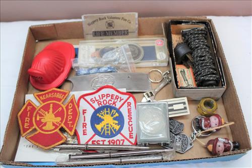Antiques & Collectibles:Machinist Box, Machinist Tools: Micrometers, Gauges, Calipers, Metal Rulers, Dial Indicators, Edge Finders, Squares & More; Large Copper "Buffalo" Fire Extinguisher, Crock w/Ears, 2 Satin Blue Fenton Lamps, Satin Blue Fenton: Vases, Plates, Fairy Lamps, Baskets, Candy Dishes, Bells, Candle Holders, Compote & Animals; CB & Early Handles/Mics, Enamel Collector Pins for NASCAR & Beer Companies, Red Pyrex Refrigerator Bowls, Pyrex w/Various Patterns (Delphite Gold Leaf), Green Glass Refrigerator Bowl, Rolling Pin, Early Color Fiesta Ware: Pitcher, Serving Bowls, Gravy Boat, Berry Bowls, S & P & More; SRU Campus Buildings Wood Replicas, Ingraham Stop Watch, Mother of Pearl Fountain Pen Set, Local Beer Chips, Lifetime Sauce Pans, Griswold Griddle #9, Wendall August Forge: Coasters, Christmas Ornaments, Dishes & Etc; Zippo Lighters & Pen,Ronson Pocket Lighter, Hammer Pocket Knife, German Radio, 8-Longaberger Baskets, Hall & McCormick Tea Pots, Wisconsin 250 Classic Auto Racing Game w/Cars, Change Purse, Truck Repair Manual, Featherlite Thermos, Emmett Kelly (Clown) Music Boxes, White House Historical Collection Ornaments, Whiskey Decanters, Tonka Fire Truck, Hasbro GI Joe MIB, Older GI Joes & Barbies & Friends w/ Clothing & Accessories; Slippery Rock Fire Department Badge, Pins & 1996 Framed Picture; Seagrave Fire Engine, Franklin Mint Bel-Air Fire Chief, Fireman: Hats, Mugs, Clocks & Mini Tea Set; American Fire Fighters Belt Buckles & Throw, Childress Lim. Ed. Collector Bottles & Glasses for RCR Racing, Starting Lineup Dale Earnhardt & Dale Earnhardt Jr. 50th Anniversary NASCAR Dolls, Anheuser-Busch Beer Steins, Heineken Delft Blue Beer Mug, Early Knife in Scabbard, Fishing Lures, FNB Bank Bags, Linens, Child's Quilt, Stoneware Bowl & Pitcher, Cameras, Historical Books: Slippery Rock Sesquicentennial History Book, 1925 Souvenir History of Slippery Rock, 1927 History of Butler County Volumes I & II, 1946 History of PA & History of the Civil War w/ "Brady" War Photographs; Small Elgin Wind-Up Clock, Hull Vase, Record Albums, Steeler: Terrible Towels, Ertl Car & Reserved Parking Sign; Slippery Rock Police Clock, Wind Beneath my Wings Music Box, Glass Frogs, Pink Depression: Ginger Jar, Plates, Bowls, Cake Plate, Candy Dishes, S & P, Toothpick Holder, Tea Cups, Butter Dish. Dale Earnhardt Jr. Life Size Cut Out, BP & Sunoco Advertising Trucks, Road Tough Die Cast BMW, Tonka: Crane, Flat Bed Truck, Bull Dozer, Back Hoe & Road Grader; 1986 Case Construction King Back Hoe, Thomas Kinkade Snow Houses, Willow Tree Figures, Red Comet Fire Extinguisher, Cast Kettle & Skillet, Astro Candy Dispensers On Stand, Fisher Price Radio Control Speedway,Play Skool Postal Station Mail Box, Art Glass Clown, Nippon & Noritake Dishes, 12 Beam Whiskey Decanters & Etc...