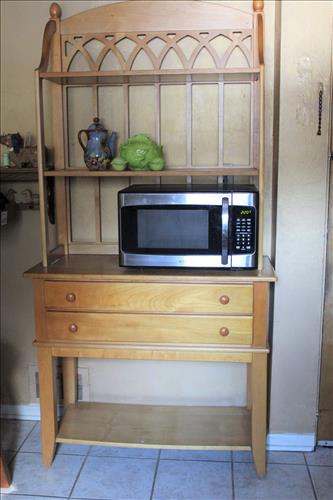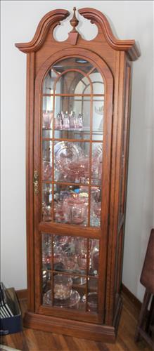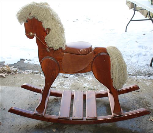 Furniture: Two - 4 Door Book Cases/Displays, High Pub Kitchen Table w/4 Swivel Chairs, Illuminated Curio, Gun Cabinet (8), Vertical Wood File Cabinet, Nesting Side Stands, Day /Trundle Bed, Small Roll Top Desk w/Drawers, Storage Hassock, 2 Drawer Side Stands, Quilt Rack, Blanket Box in Paint, Child's Chair, White Wicker Chair, Floral Metal Wall Art, TV Trays, Heart Plant Stand, Wood Bakers Rack, 2 Bar Stools, Child's Oak Combo High/Rocking Horse, High Chair, Waterfall Armoire & Vanity, Cane Bottom Rocker & Foot Stool, Oak School Desk, Wood Rocking Horse, Brown Wicker Chairs & Etc..