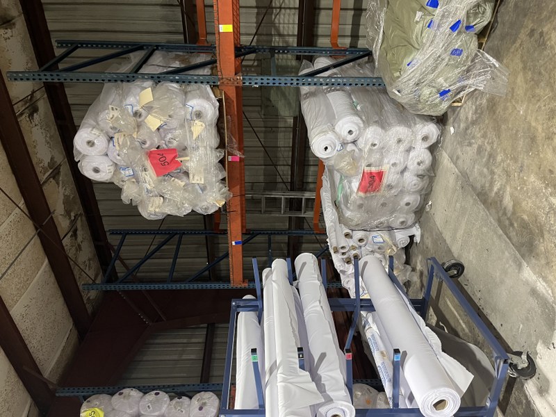 303 - LOT CONSISTING OF MATERIAL RACK WITH APPROXIMATELY (24) PARTIAL ROLLS OF FABRIC