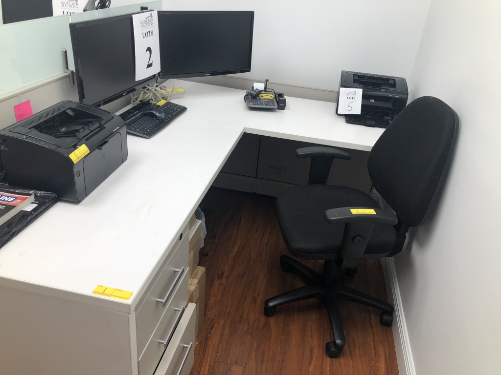 21 - LOT OFFICE SUITE CONSISTING OF (2) L SHAPED DESKS, (2) ADJUSTABLE ROLLING CHAIRS, INCLUDES MISCELLANEOUS OFFICE SUPPLIES, WASTE CANS