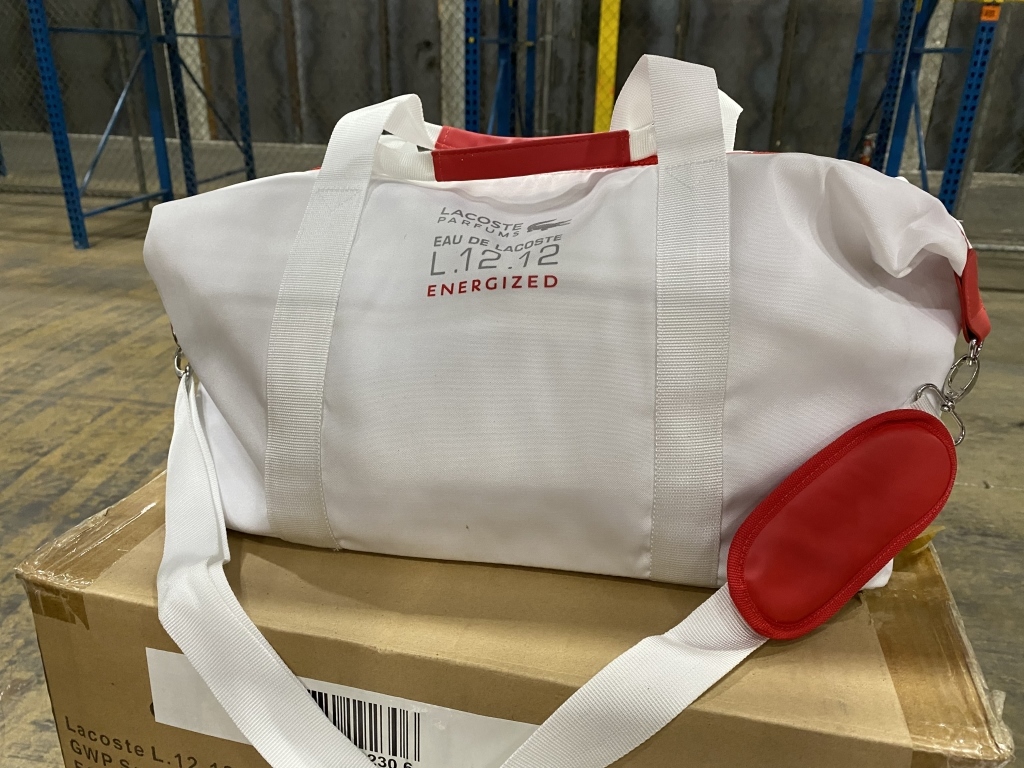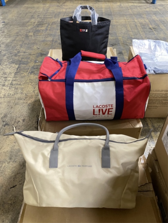 365 - LOT ASSORTED PROMOTIONAL ITEMS INCLUDING INCLUDING GIVENCHY AFTER SHAVE BAUM IN POUCH (150)+/-, KENZO MAKE-UP BAGS (100)+/-, DOLCE GABANA BLOW UPS (12)+/-, (20)+/- ASSORTED BAGS: HUGO BOSS, LACOSTE, SAMSONITE, ETC. (COUNTS ARE APPROXIMATE +/-)