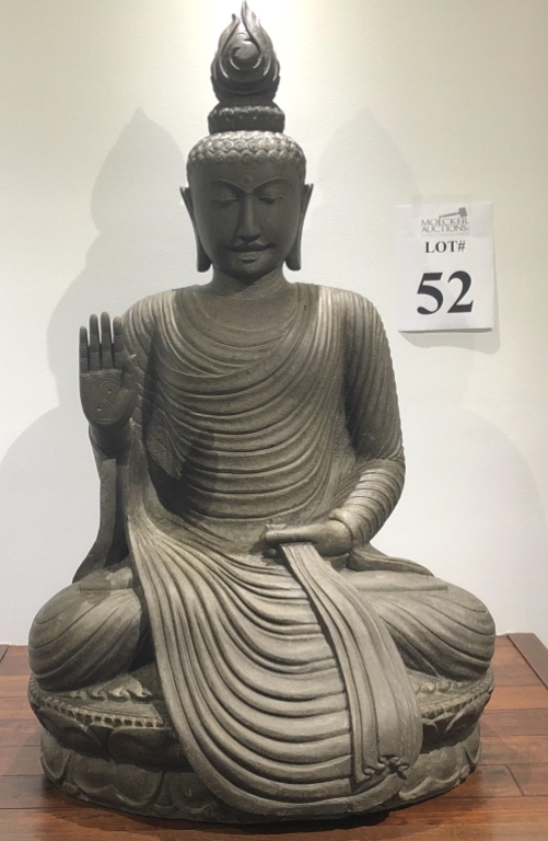 52 - BUDDHA STATUE MEASURES APPROXIMATELY 57" H X 32" W AT BASE X 30" D (EXTREMELY HEAVY)