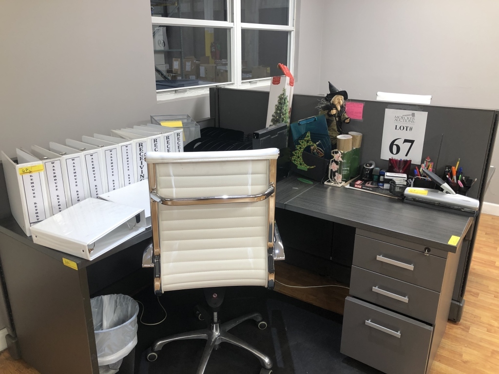1 - LOT OFFICE SUITE INCLUDING (2) L SHAPED DESKS WITH PARTITION AND (2) EXECUTIVE CHAIRS, (1) ROLLING FILE; ALSO INCLUDES OFFICE SUPPLIES ON DESKS: SCALE, CALCULATORS, ETC.