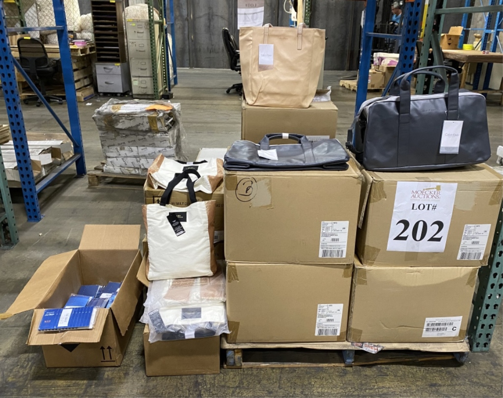 357 - ASSORTED CALVIN KLEIN TOTES AND BAGS (175)+/- TOTES, (145)+/- PINK COSMETIC BAGS, (145)+/- GREY COSMETIC BAGS (COUNTS ARE APPROXIMATE +/-)