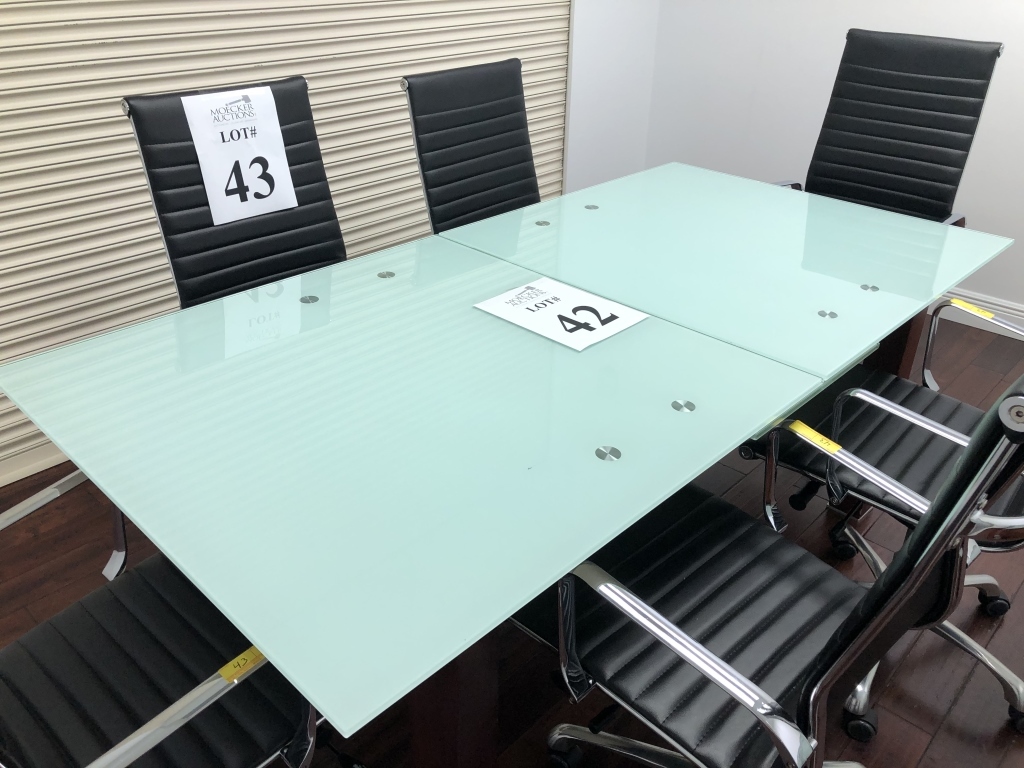 42 - GLASS TOP CONFERENCE TABLE MEASURES 79" X 39 1/2", CENTER LEAF POPS UP TO EXPAND BY 18", INCLUDES MATCHING CREDENZA THAT MEASURES 59"L X 39"H X 18" D (VERY NICE)
