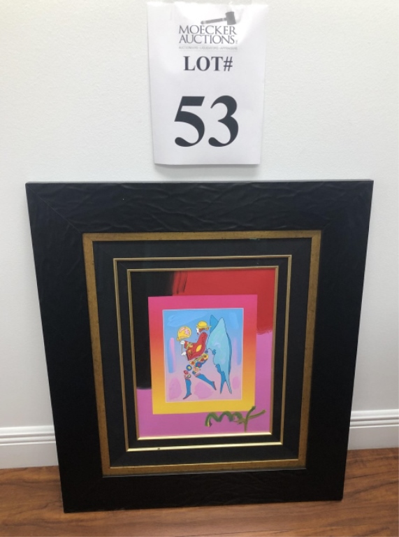 53 - PETER MAX FRAMED ART "TIP TOE FLOATING" 2007 "TIP TOE FLOATING" VARIATION COLOR COMBINATION (AND BRUSHSTROKES) FROM HIS ORIGINAL ARTWORK OF THE SAME TITLE ON PAPER. ACTUAL SIZE: 17" X 13" (FRAMED)OVERALL MEASUREMENTS ARE 28" W X 32" H, (2007)