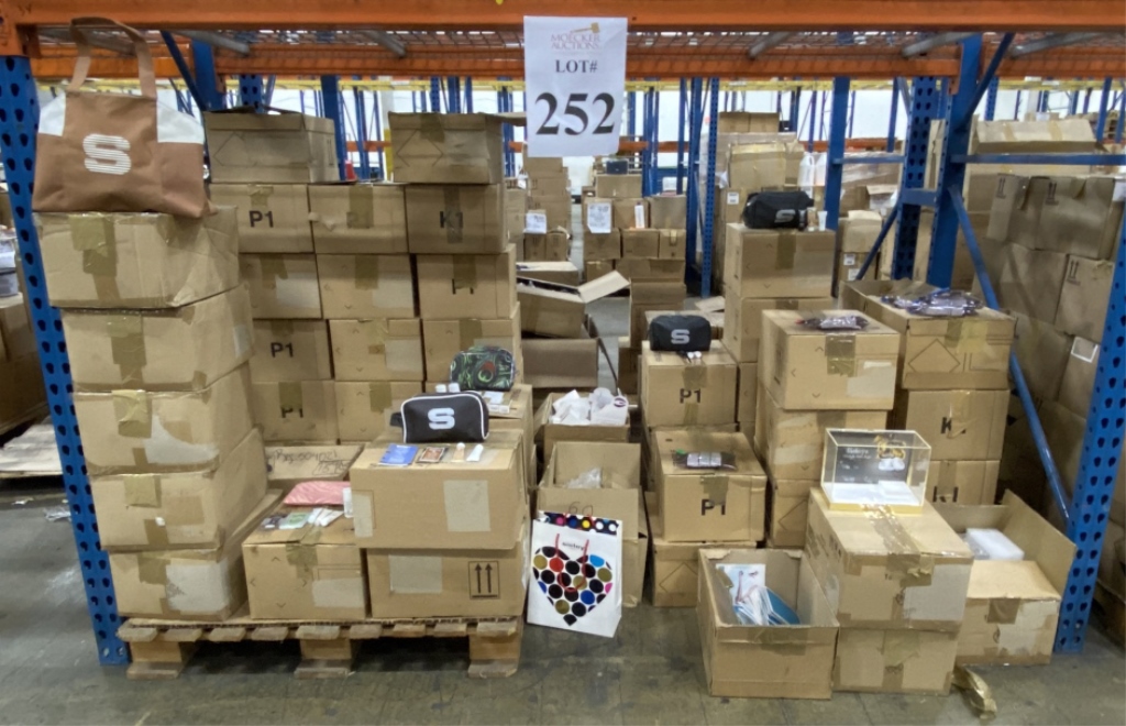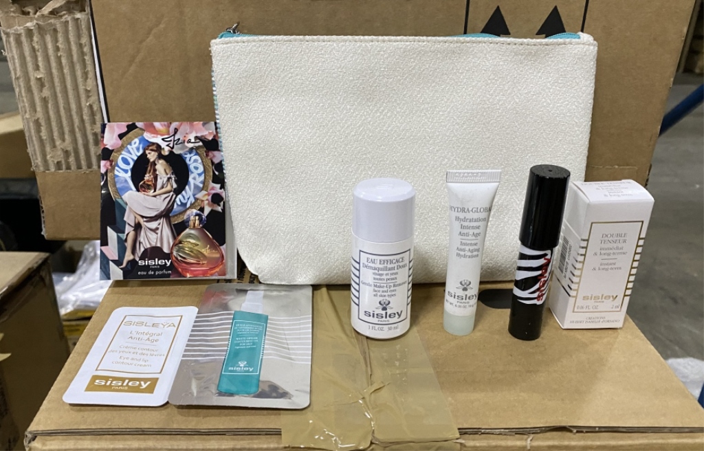 358 - PALLET ASSORTED DISPLAYS AND PROMOTIONAL ITEMS INCLUDING CREED GIFT BAGS (500)+/-, TIGI HAIR COLORING (70)+/-, DOLCE GABABA FRISBEES, DOLCE GABANA GIFT BAGS, NARCISCO RODRIGUEZ SMALL PURSES AND GIFT BAGS, CHLOE GIFT PAD SETS, ELIZABETH ARDEN PURIFYING CREAM CLEANSER (100)+/-, (100)+/- NARCISCO RODRIGUEZ NOTE PADS (40)+/- GIVENCHY TESTERS (100)+/, ELIE SAAB TESTERS (100)+/, SEVERAL HUNDRED ASSORTED KENZO MAKE UP BAGS, NARCISCO RODRIGUEZ JEWELRY TRAVEL CASES, CLARINS KEY CHAINS (25)+/-, ELIE SAAB GIFT BAGS, FLOWER HAIR TIES ASSORTED DISPLAYS, (THIS IS A GREAT ASSORTMENT LOT, OVER A THOUSAND PIECES) (SEE PHOTOS) (COUNTS ARE APPROXIMATE +/-)