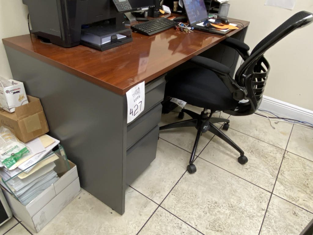 427 - LOT OFFICE SUITE CONSISTING (3) DESKS, (1) L SHAPED AND (2) REGULAR DESKS, (2) CHAIRS AND ASSORTED OTHER OFFICE SUPPLY ITEMS ON DESKS