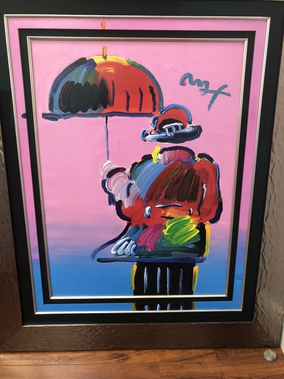 56 - PETER MAX FRAMED ART "UMBRELLA MAN" 2007 "UMBRELLA MAN" VARIATION COLOR COMBINATION (AND BRUSHSTROKES) FROM HIS ORIGINAL ARTWORK OF THE SAME TITLE ON PAPER. ACTUAL SIZE: 32" X 24" (FRAMED)OVERALL MEASUREMENTS ARE 39" W X 47 1/2" H, (2007)