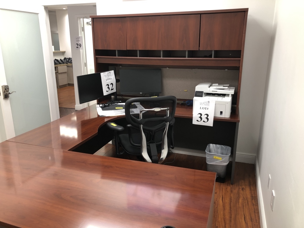 24 - LOT OFFICE SUITE CONSISTING OF (1) U SHAPED DESK, (1) HIGH BACK EXECUTIVE CHAIR, (2) ROLLING CLIENT CHAIRS, (1) MATCHING STORAGE CABINET/CREDENZA, (1) SMALL STAND, MISCELLANEOUS OFFICE SUPPLIES (NICE OFFICE SWEET)