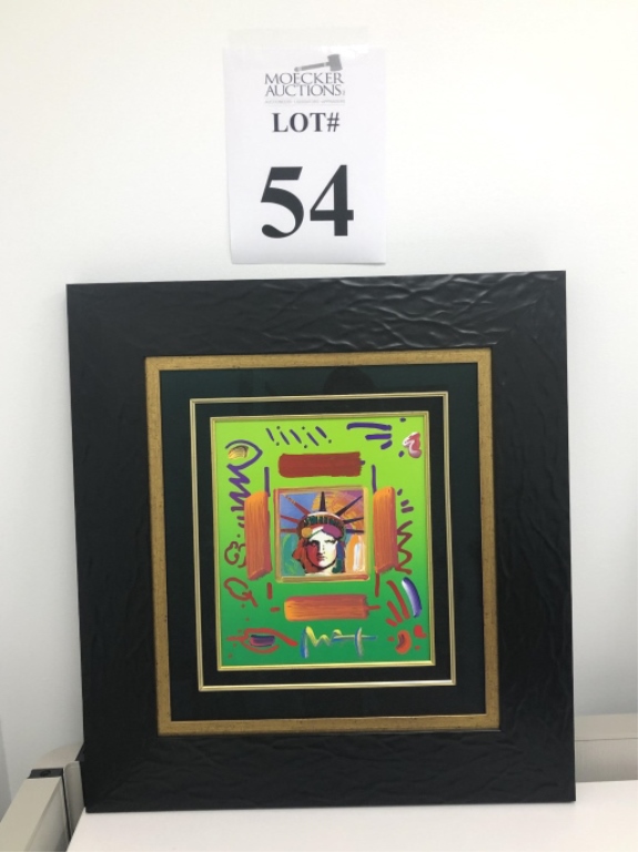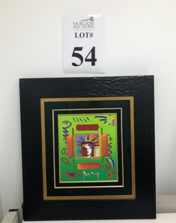 54 - PETER MAX FRAMED ART "LIBERTY" 2007 "LIBERTY" VARIATION COLOR COMBINATION (AND BRUSHSTROKES) FROM HIS ORIGINAL ARTWORK OF THE SAME TITLE ON PAPER. ACTUAL SIZE: 14" X 12" (FRAMED)
