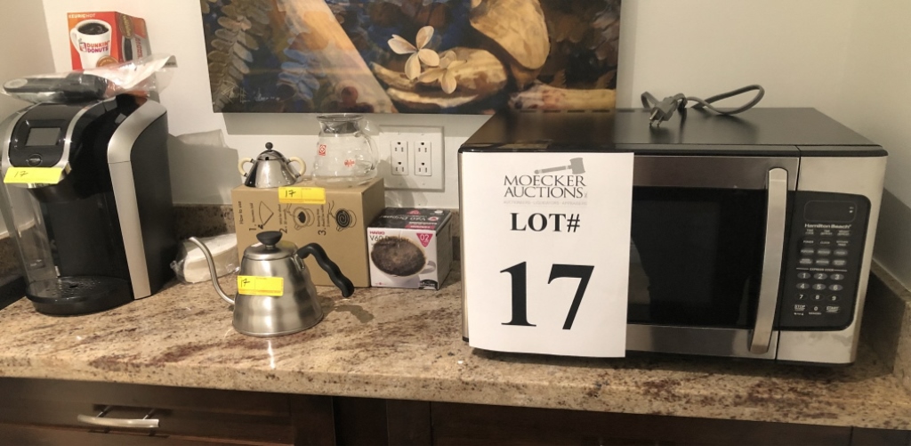 17 - LOT ASSORTED KITCHEN APPLIANCES AND ASSORTED ITEMS INCLUDING HAMILTON BEACH MICROWAVE, KEURIG 2.0 COFFEE MAKER, DRIP KETTLE, POUR OVER COFFEE KIT, ASSORTED DISHWARE, SMALL SERVING CART WITH SERVING TRAY, STAINLESS STEEL WASTE CAN, ETC.