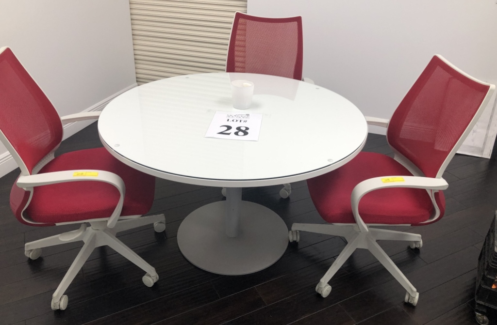 28 - 48" ROUND GLASS TOPPED TABLE WITH (3) ADJUSTABLE RED MESH BACK CHAIRS