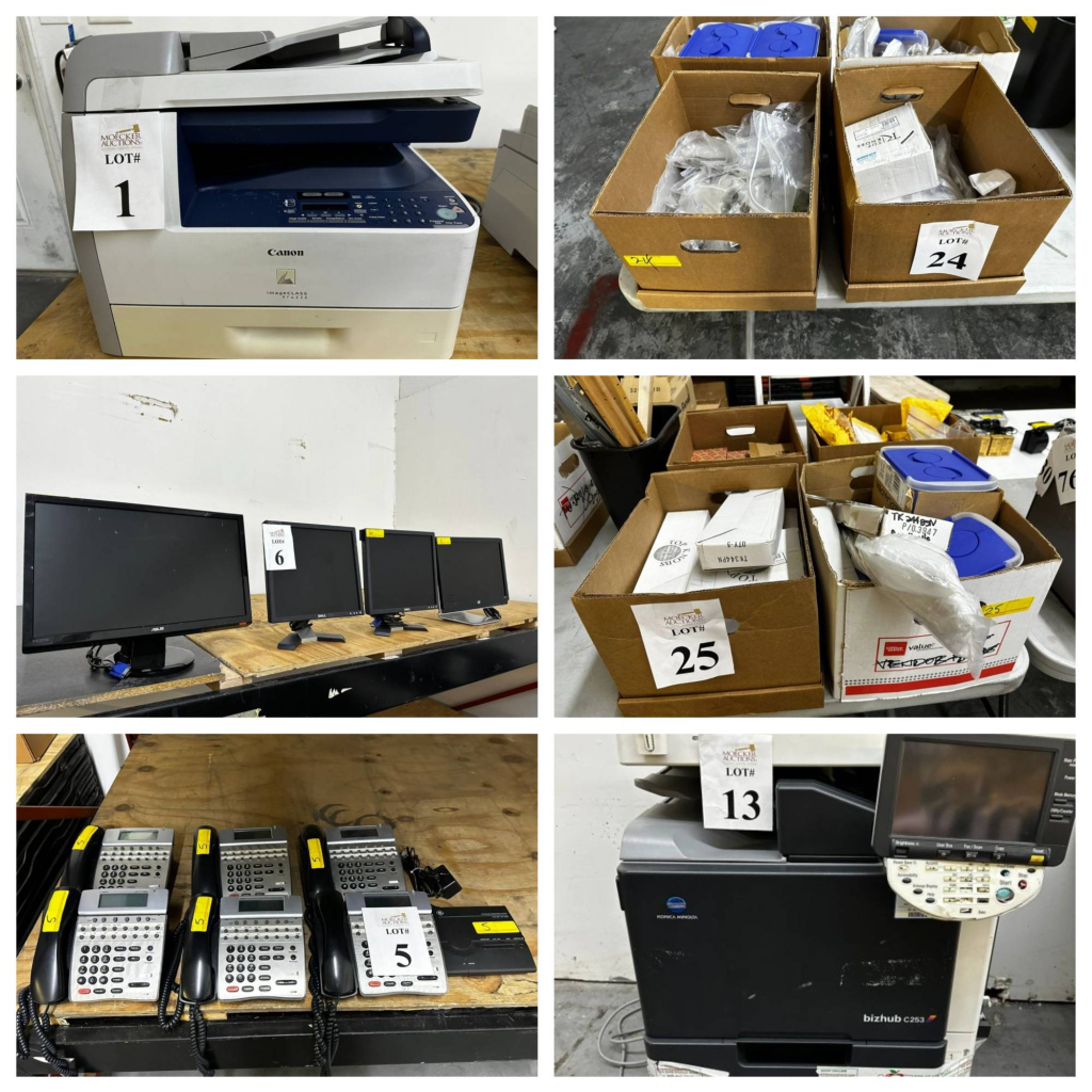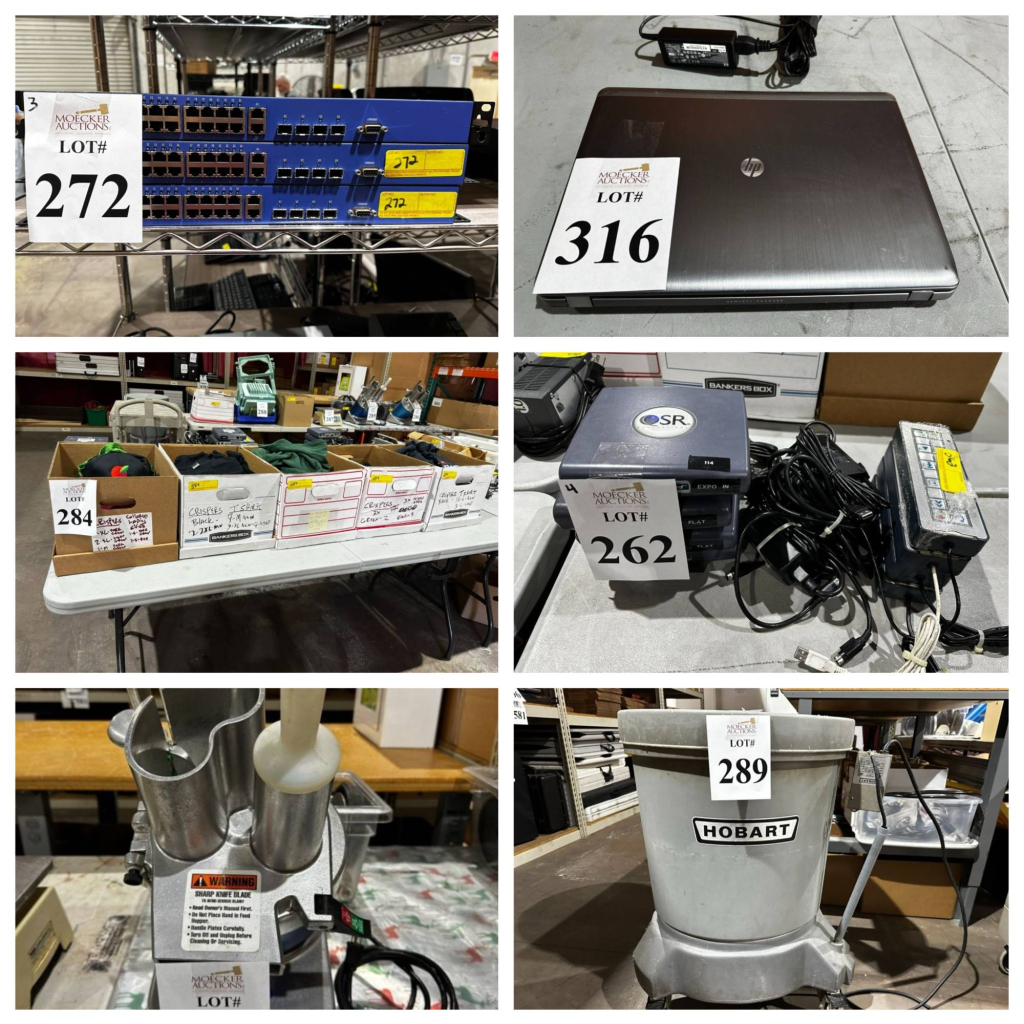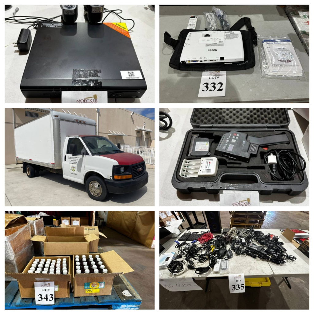 Sale will consist of: switches, routers, security appliances, laptops, servers, computer peripherals, assorted kitchen equipment, promotional items, racks, POS systems, kitchen video controllers, computers, monitors, printers, assorted hardware for cabinets, NEC phones, LED track lightbulbs, wireless phones, office supplies, electronics, supplements, scanner, security cameras, 2004 GMC Savana G3500 cargo 16’ box truck and more.