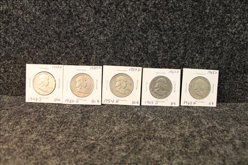 Franklin Halves: 1963-D, 1948-D, 1954-D, 1963-D & 1950-D