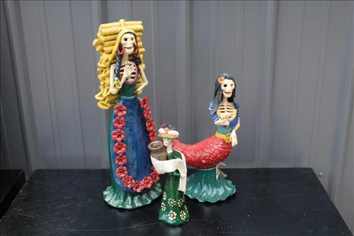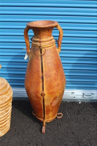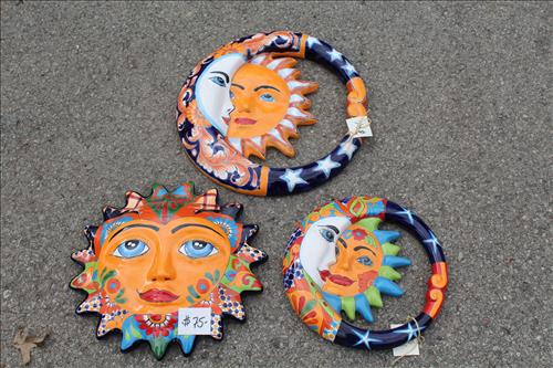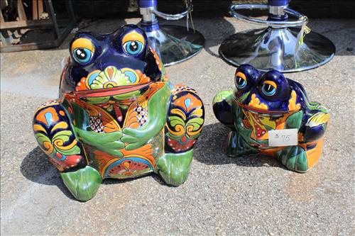 New Outdoor Decorations & Metal Yard Art: Wrought Iron Base Tables, Iron Bird Cage, Ceramic Coyote, Lg Lantern Light, Tin Anchor, Ceramic Frogs, Chiminea, Cast Alum. Cherub Sculpture w/Bowl, Large Planters & Urns, Baked Ceramic Frog Planters, Trestle, Mexican Man Planters, Clay Suns w/Holders, Clay Sun Chime, Metal Signs, Ram Planters, Metal Flowers, Metal Beer Sign, "5 O'clock Somewhere" Sign, Aluminum Lantern, Artificial Mango Tree & More...