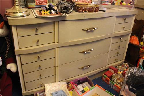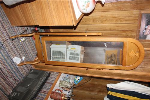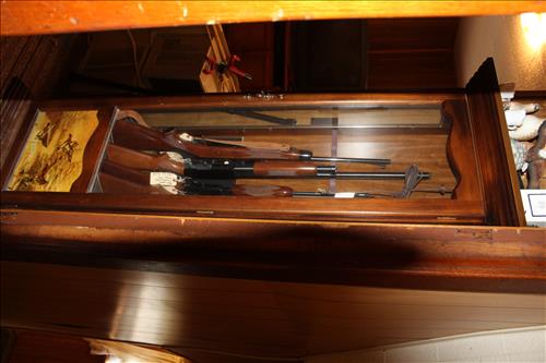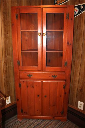Furniture:Illuminated Curio, 2 Seat Metal Glider, Card Table & Chairs in Box, Mini Electric Fireplace, (6) Gun Glass Front Gun Case, Pine Corner Cabinet, Single Drawer Wash Stand, Blonde Dresser & Highboy, Armoire, Floor Mirror Jewelry Cabinet, Drum Table, Red Plastic Rocker, Welcome Bench, Stereo Cabinet & More.
