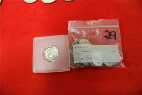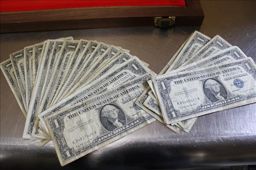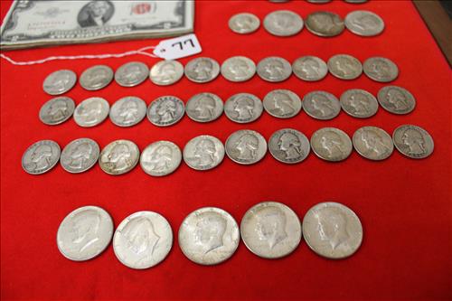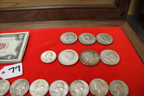 Sterling Silver, Gold, Coins & Jewelry:Franklin Mint Coin Sets of All Nations,Silver Coins: 1884-0 & 1887 Morgan Dollars, 1922 & '25 Peace Dollars, (30+) Washington Quarters, (25+) Kennedy Halves, Mercury Dimes, Roosevelt Dimes & (22) Silver Certificates; Red Dot 1963 $5, 1 Troy Oz Silver Bar, 1833 1¢ & 1866 2¢ Pieces, 1907 Indian Penny, Buffalo Nickels, US Mint Coin Sets: 1970, '71, '74, '75, '76 & '77; Gold: 14K Bracelets, Necklace w/ Pendant & (7) 14k & 10K Rings w/ Gemstones; Sterling Silver: Horse Charm Bracelet, Large Amount of Necklaces, Pendants, Bracelets & Rings, Tiffany Bracelet, Reed & Barton Flatware Set for 4 w/ Serving Pieces & Costume Jewelry.