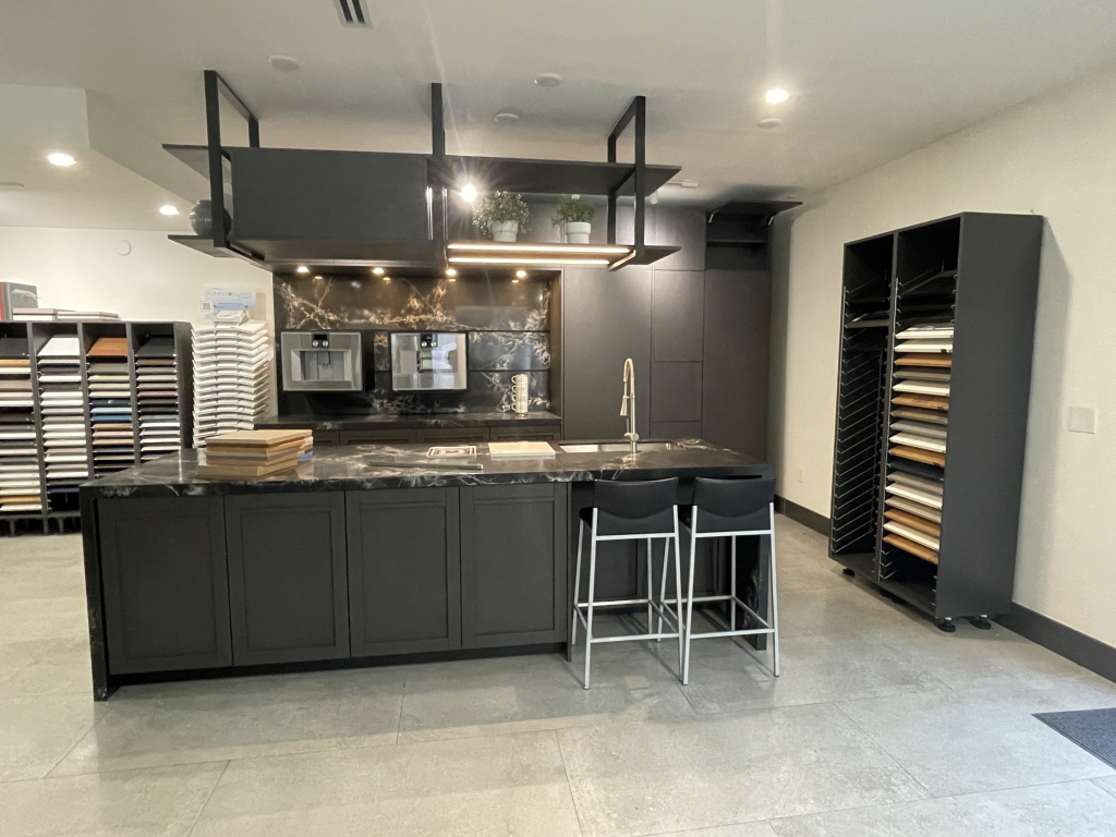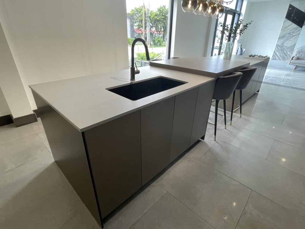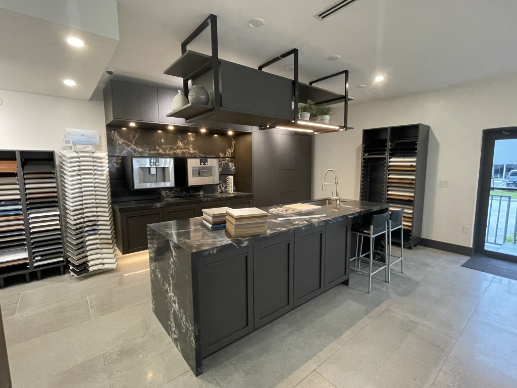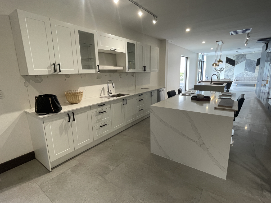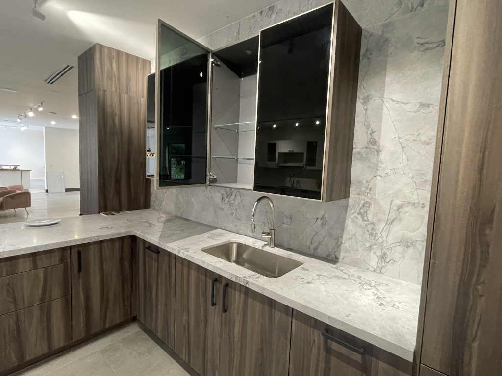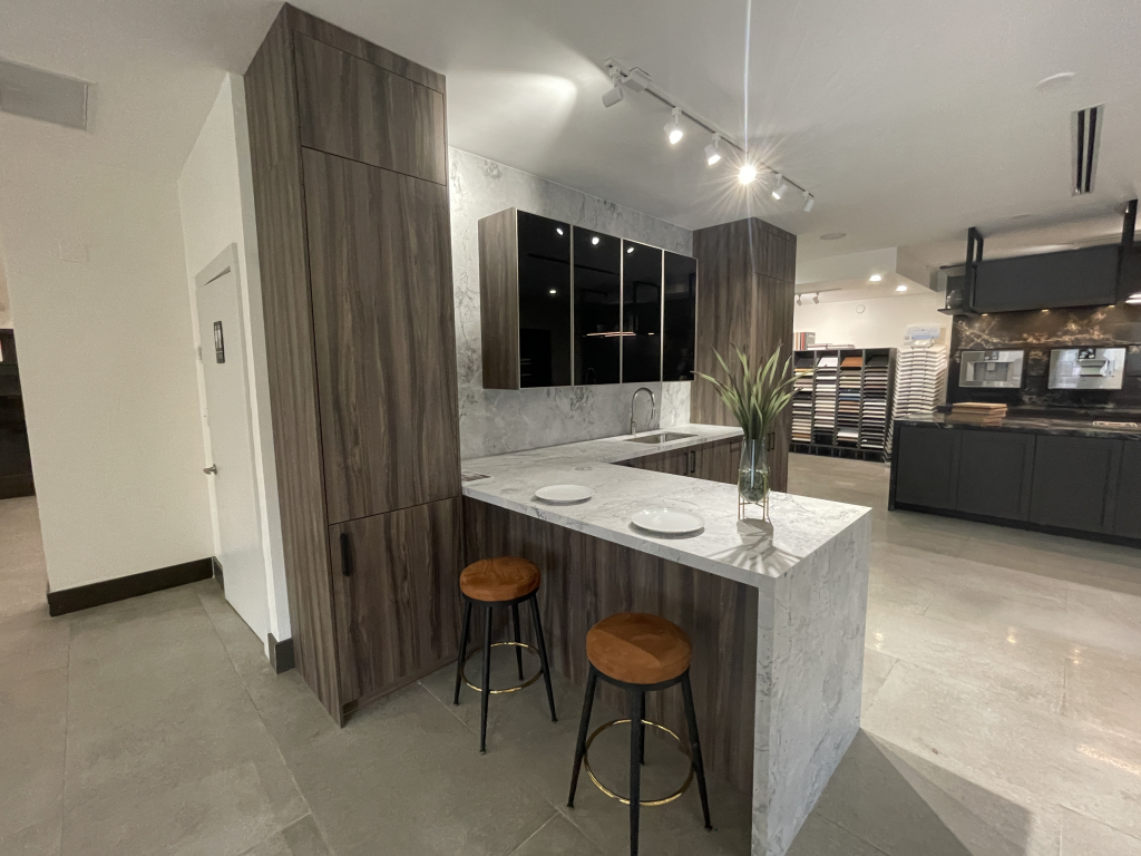 The kitchen displays are made with high quality cabinetry materials (mostly imported from Germany) including, soft touch door and drawer hardware, quartz countertops and innovative storage solutions built into each.