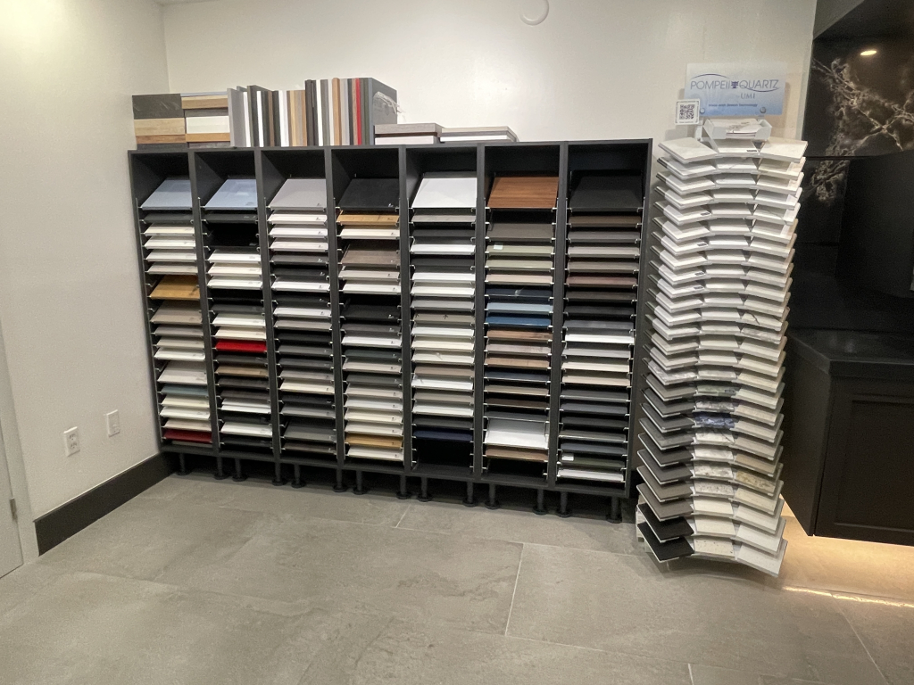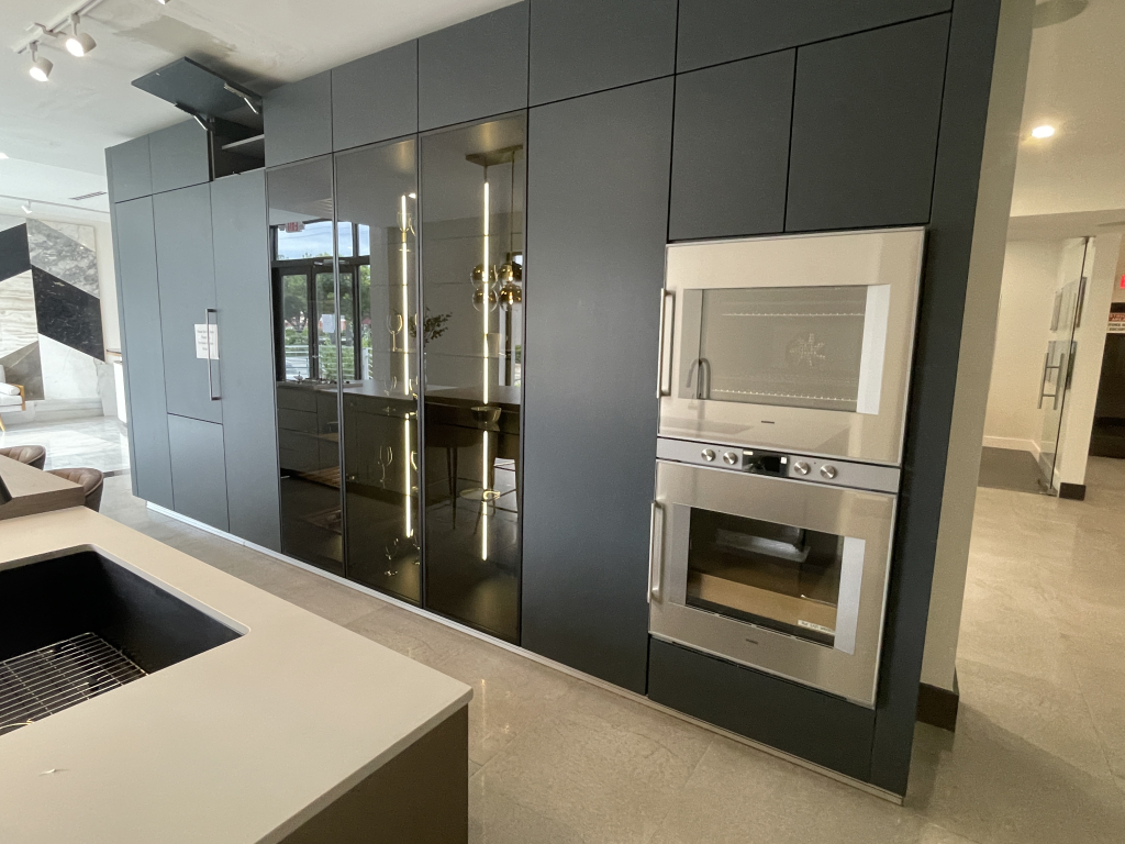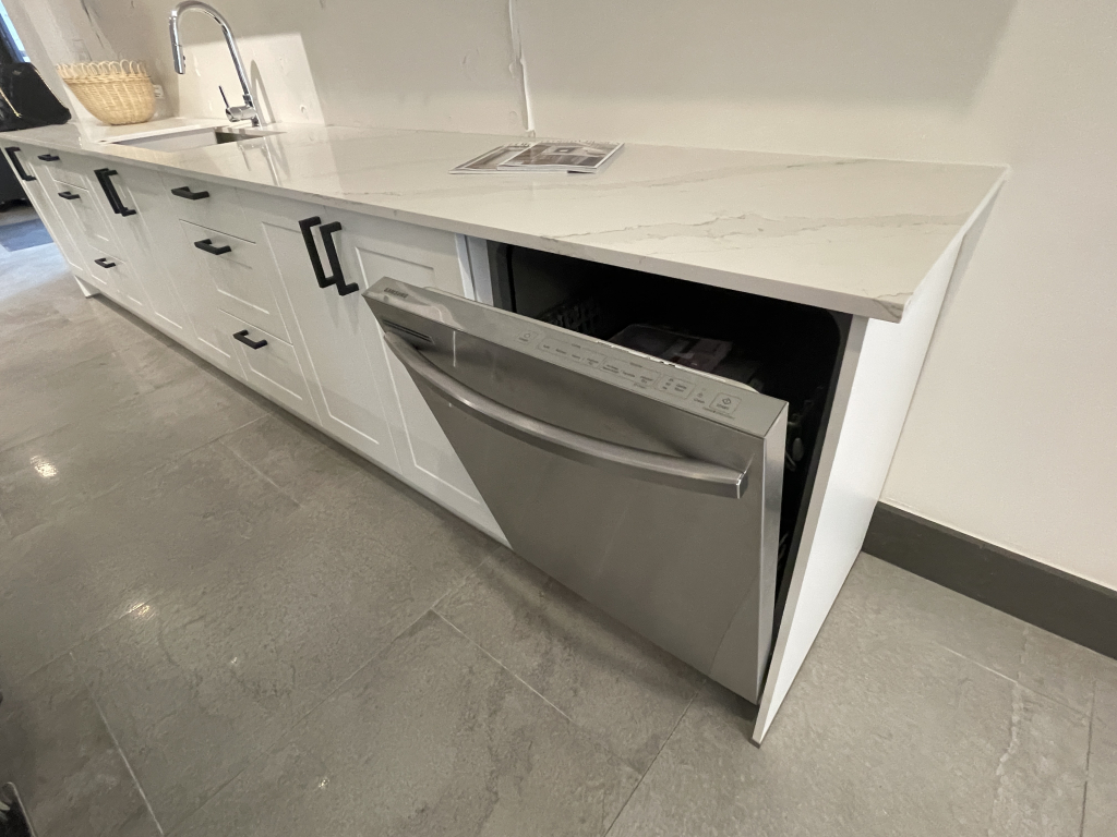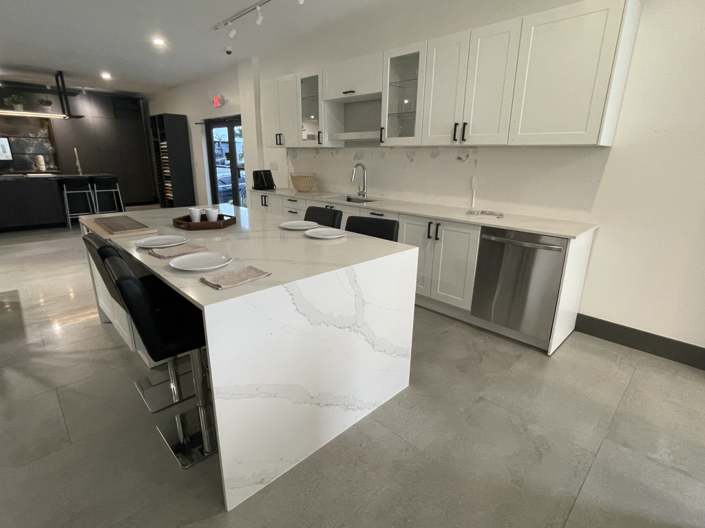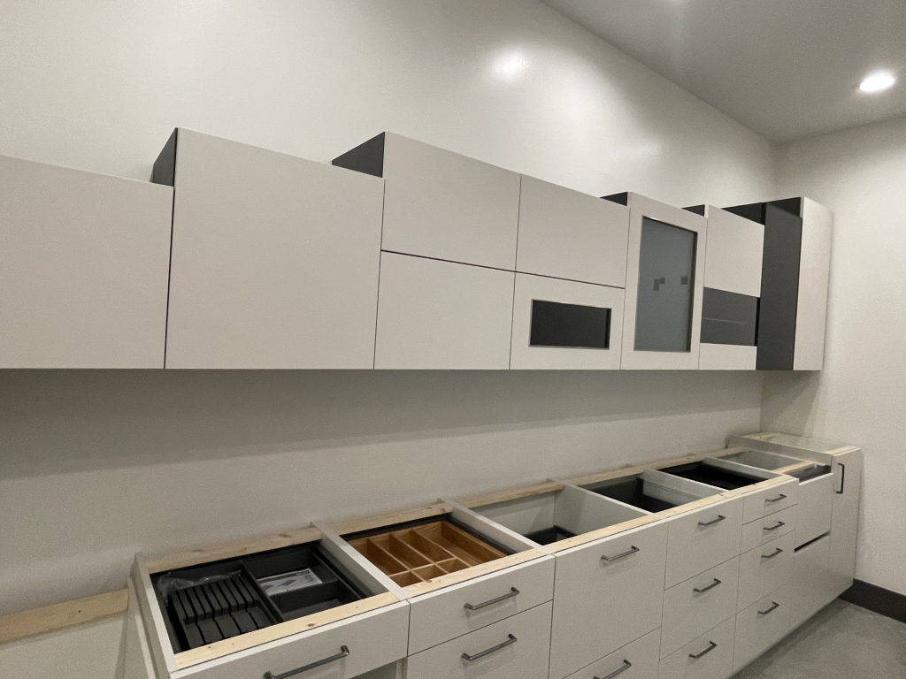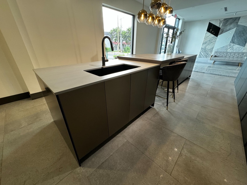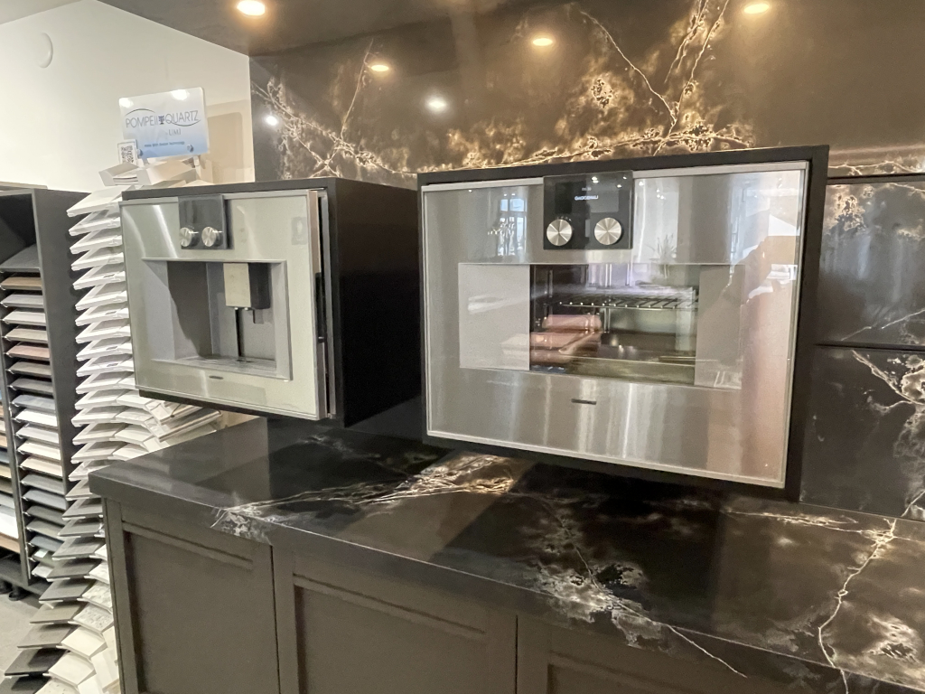 The kitchen displays are made with high quality cabinetry materials (mostly imported from Germany) including, soft touch door and drawer hardware, quartz countertops and innovative storage solutions built into each.