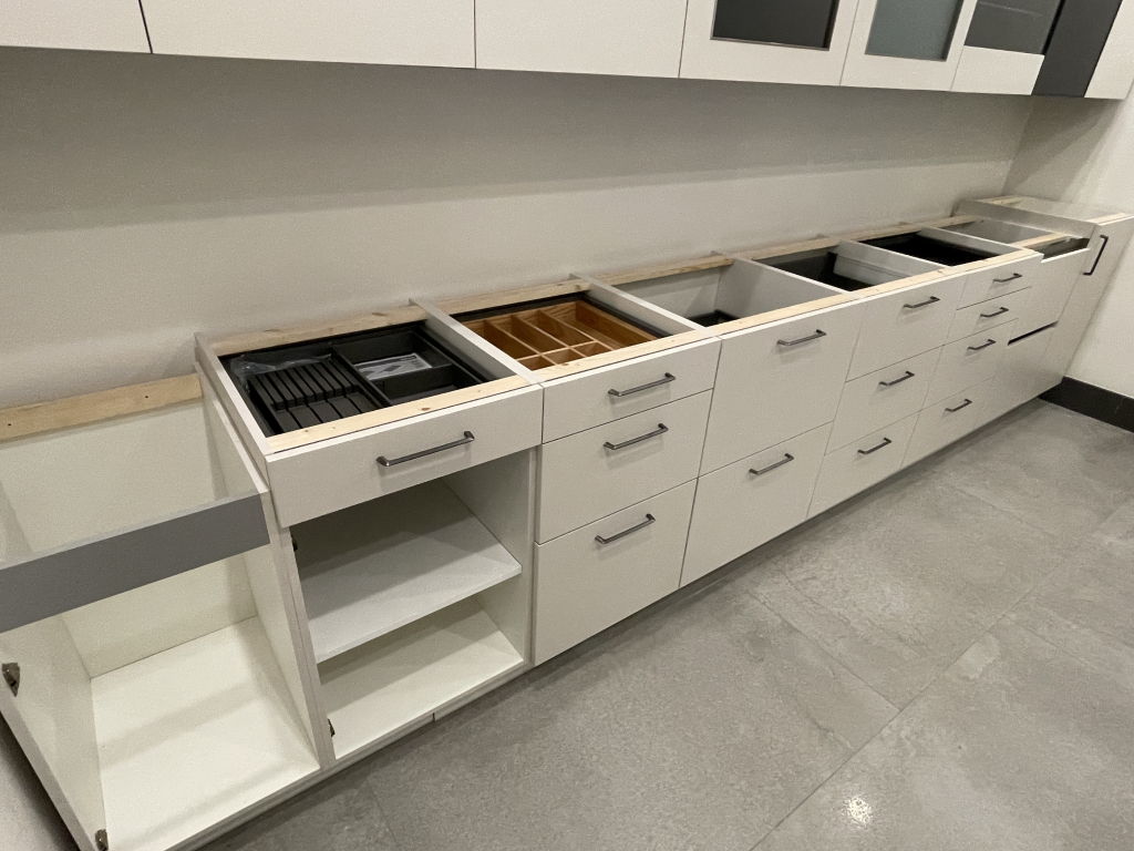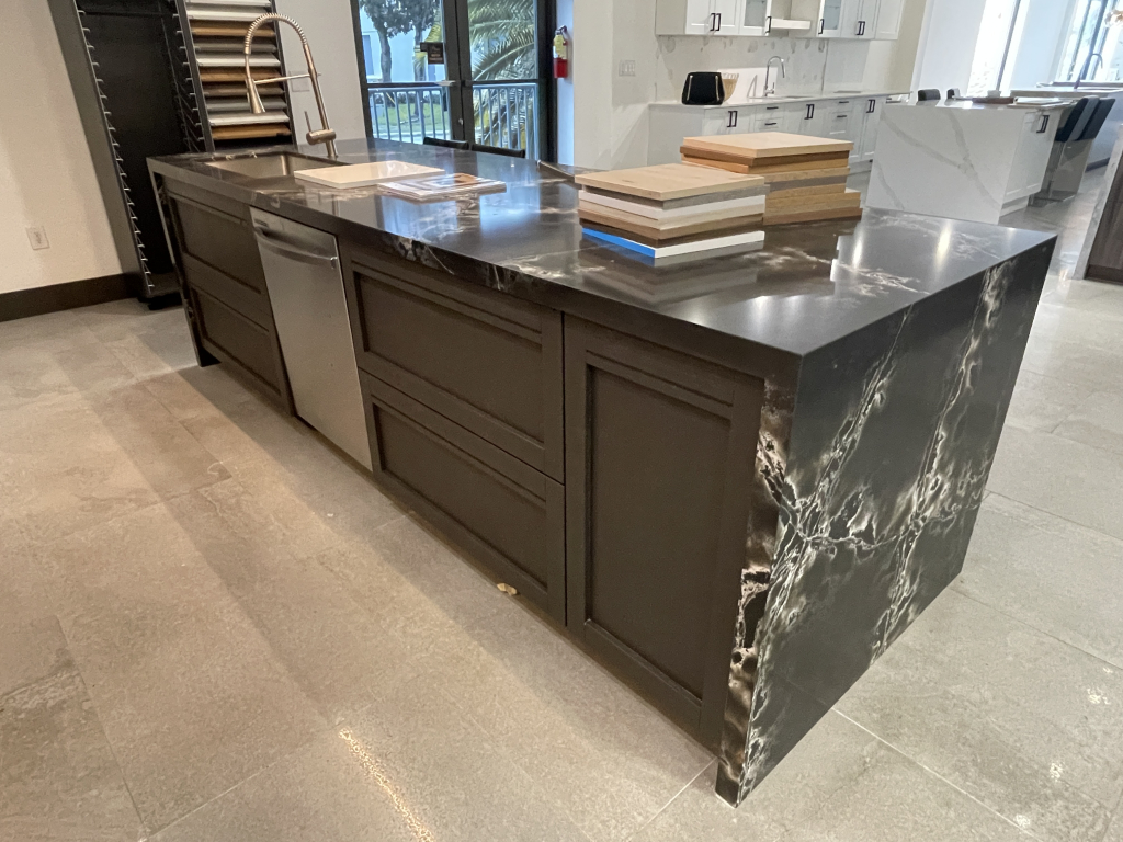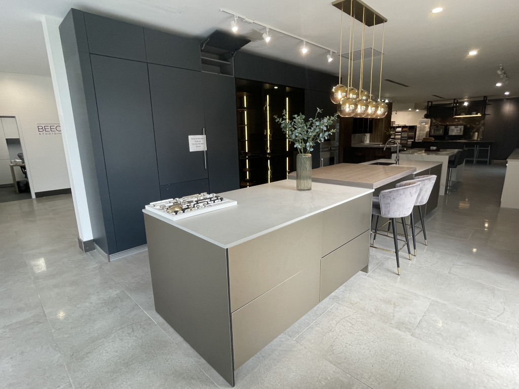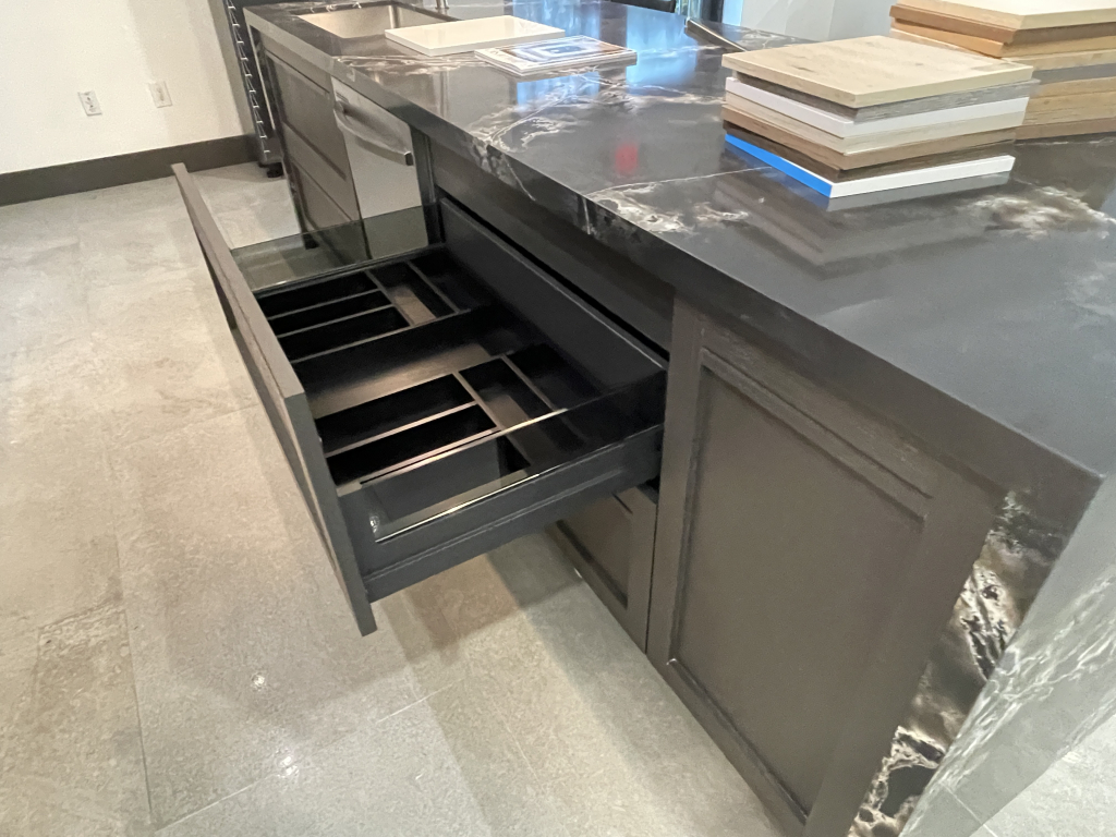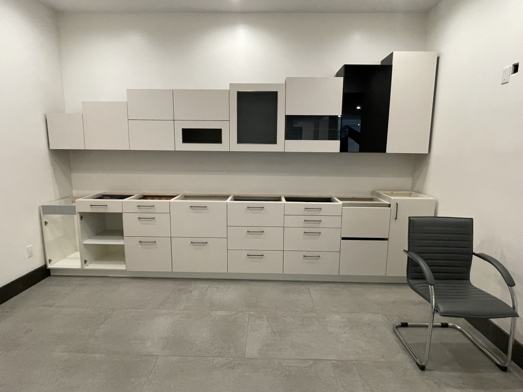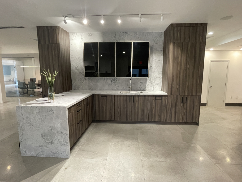 The kitchen displays are made with high quality cabinetry materials (mostly imported from Germany) including, soft touch door and drawer hardware, quartz countertops and innovative storage solutions built into each.