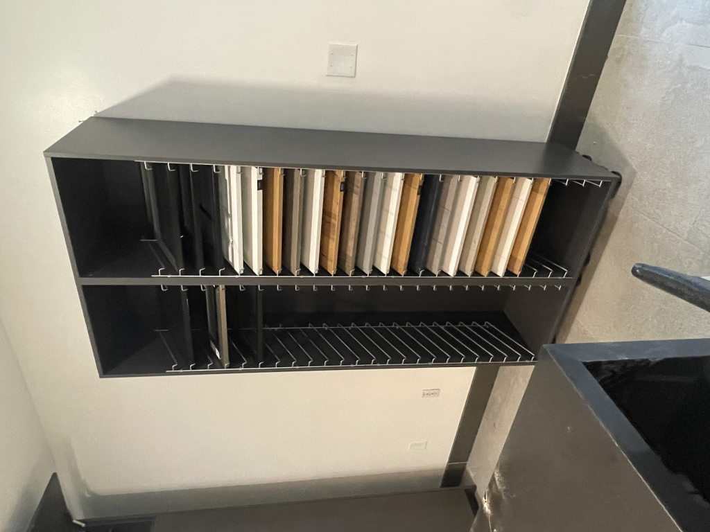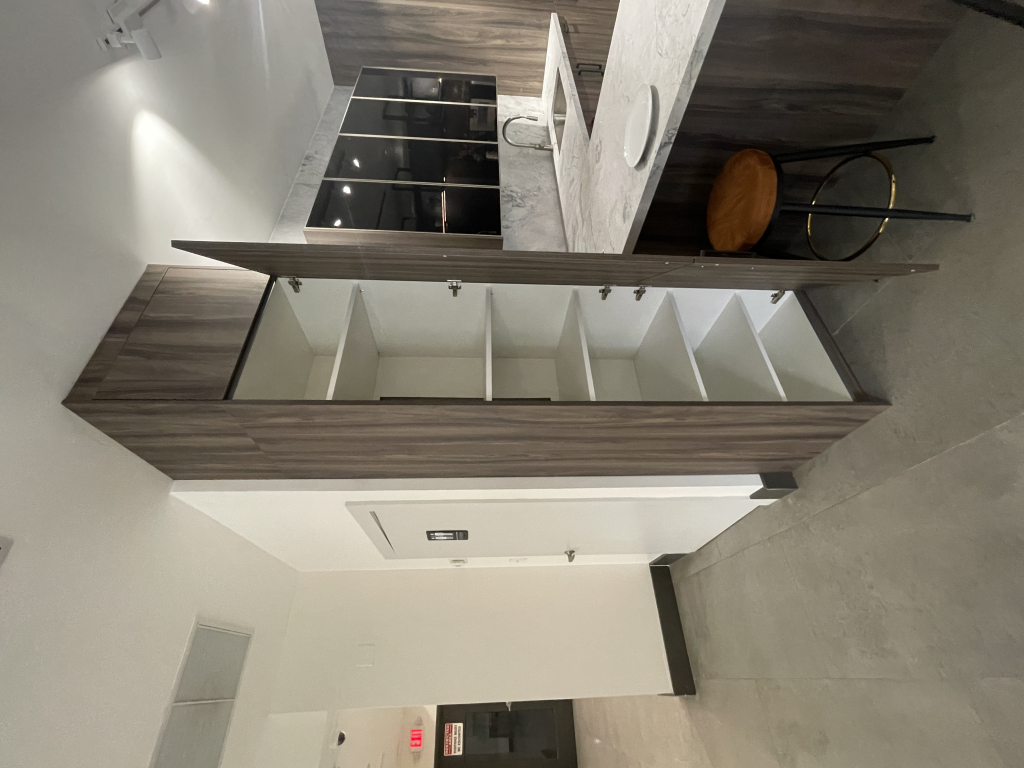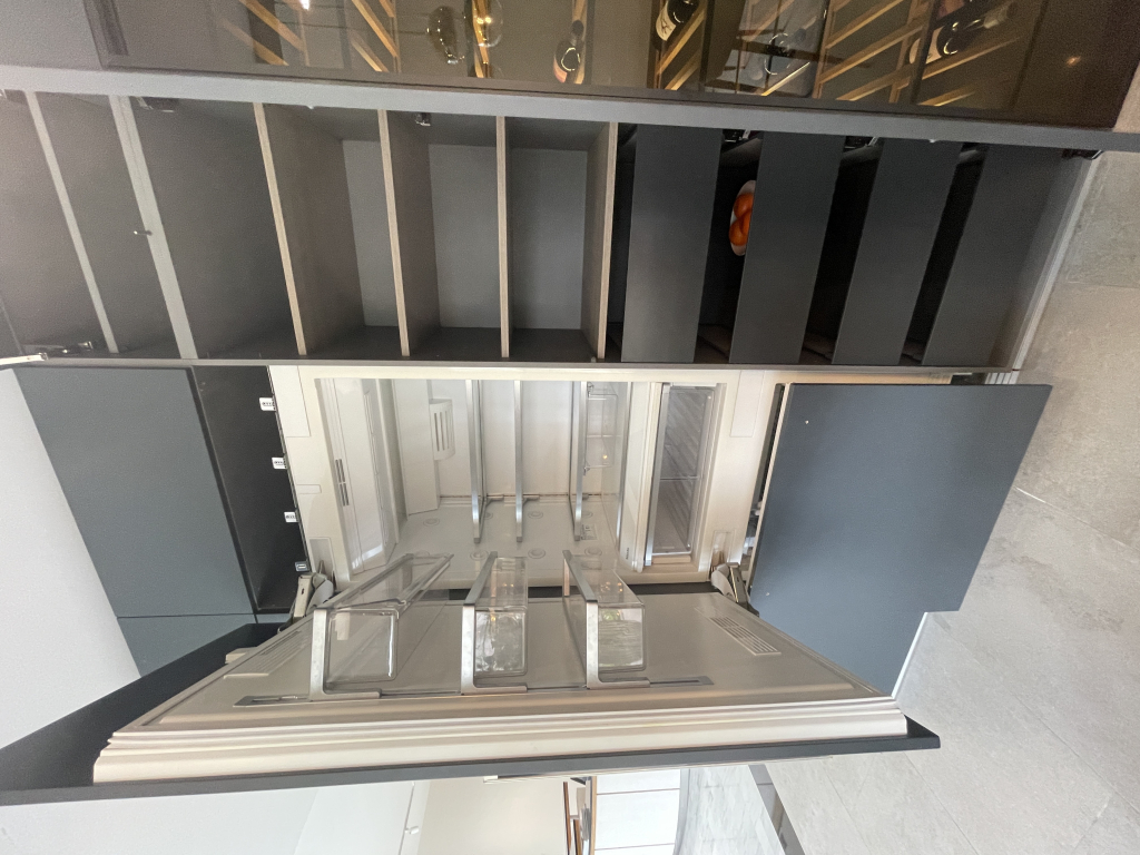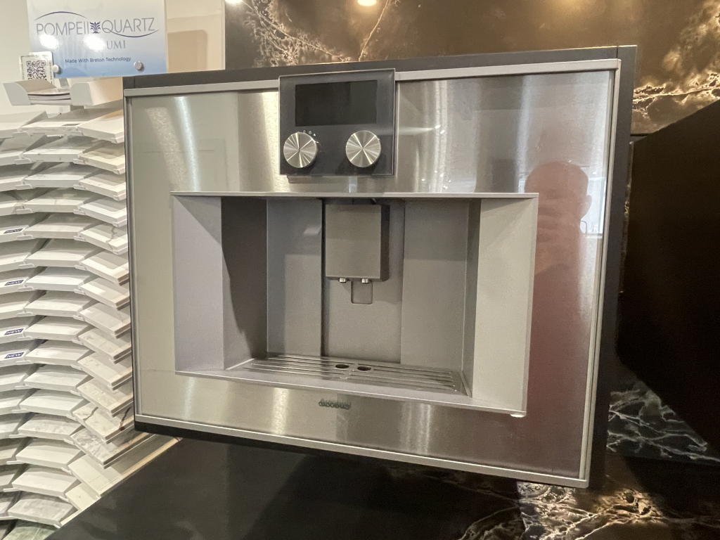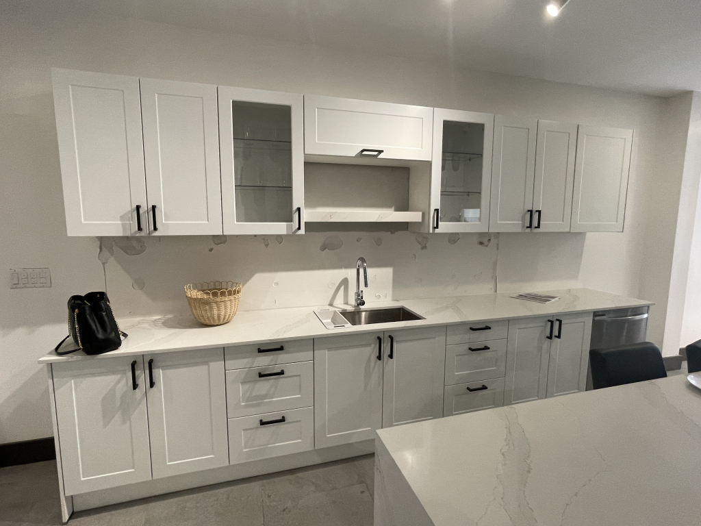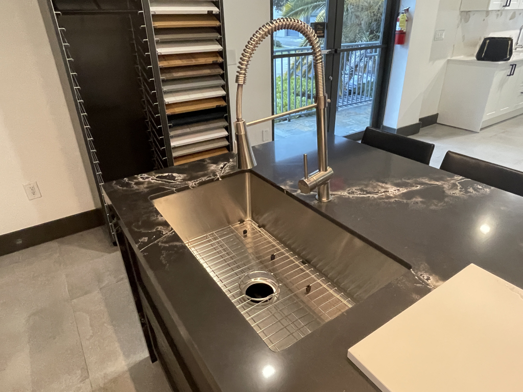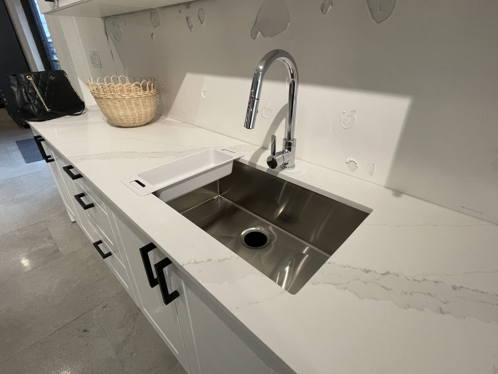 The kitchen displays are made with high quality cabinetry materials (mostly imported from Germany) including, soft touch door and drawer hardware, quartz countertops and innovative storage solutions built into each.