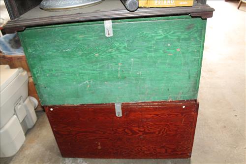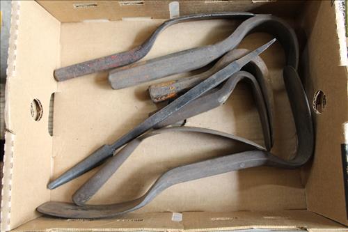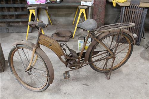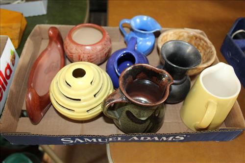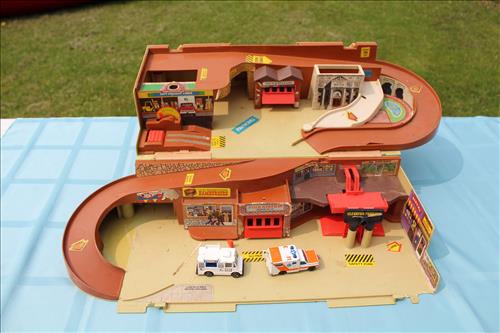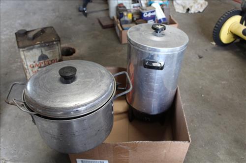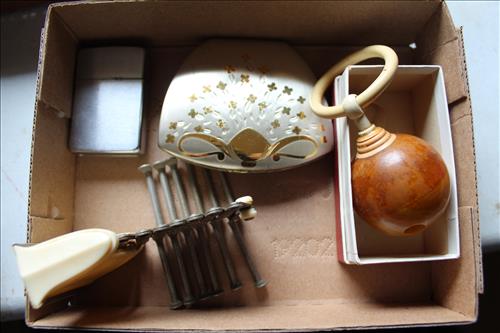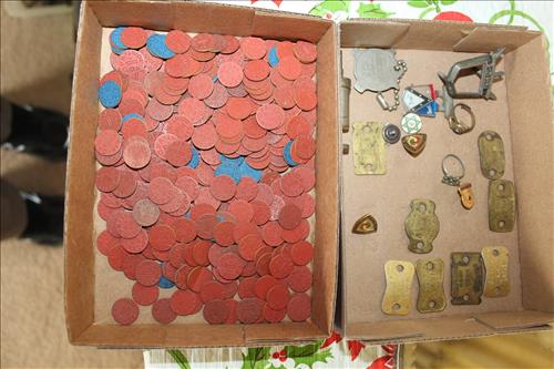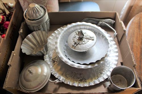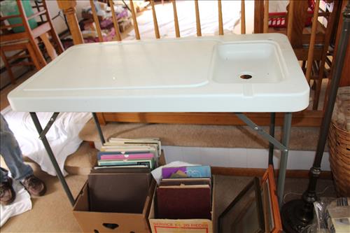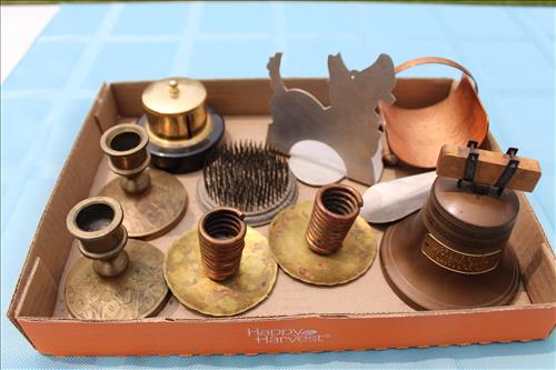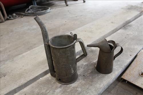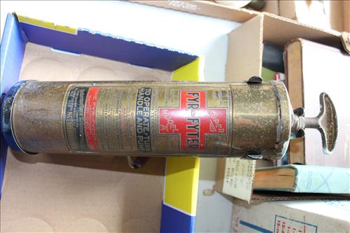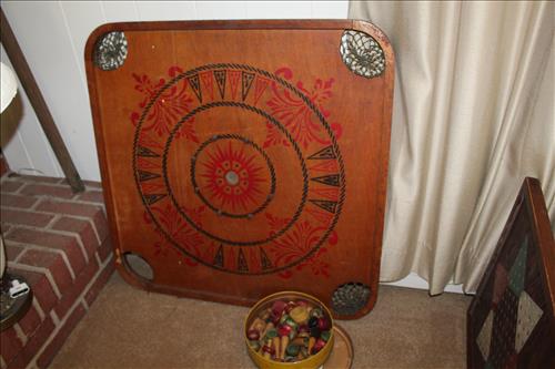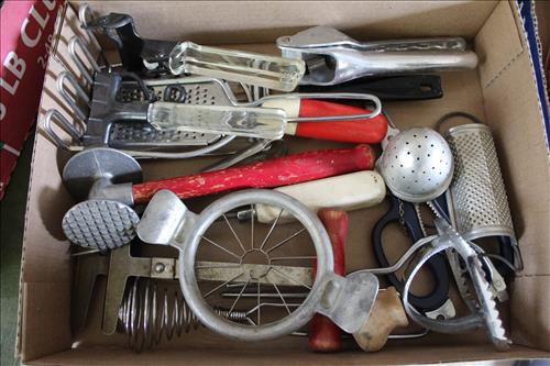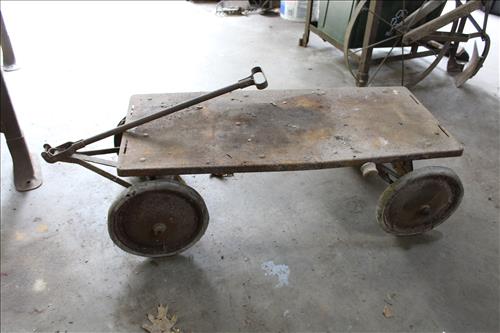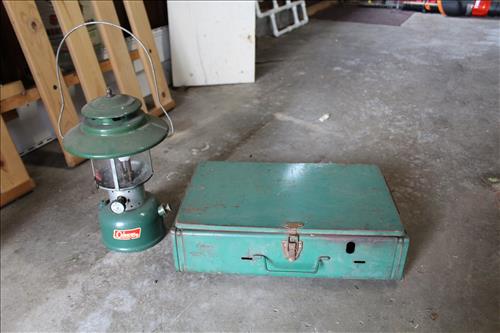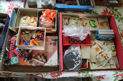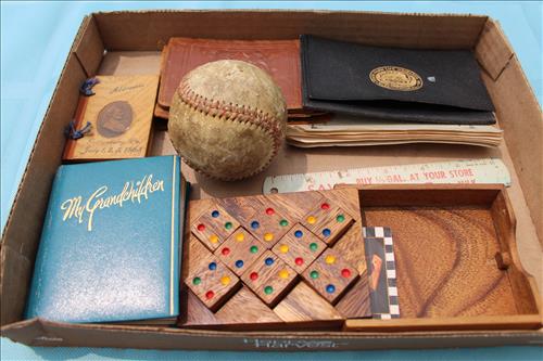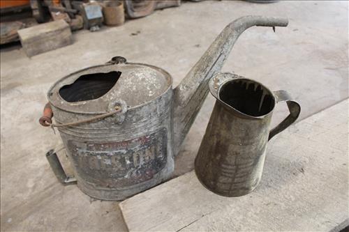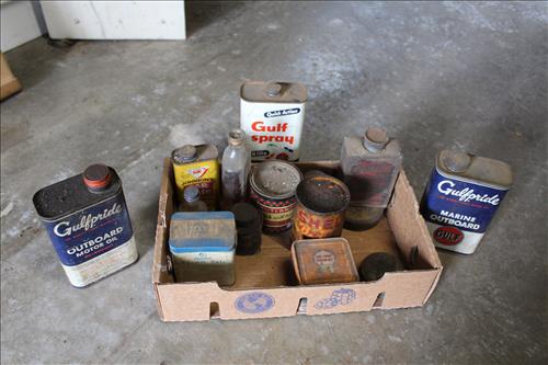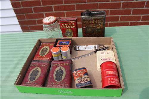 Collectibles & Curiosities:Sears Aluminum Laundry Tub, Wood Framed Chalkboard, Enameled Light Shades, Records, Trunk, Celluloid Dresser Set, Aluminum Wares, Pottery, Hot Wheels City Play Station, Tru-Vue Film Viewer, Cox Dune Buggy Gas Engine Powered Toy, Tonka Dump Truck, GE Metal & Copper Tags, Gilbert Erector Set, Early Post Cards, Pocket Knives, Advertising Tins: Prince Albert, Whiz, Union Leader, Capital & Etc; "Dodge" Saves & Lucky Joe Banks, Reynolds Binoculars, Crosman & Daisy BB Guns, Carnival Glass: Pitcher w/6 Water Glasses, Dish, Vase & Bowls; Amethyst &Green Carnival Glass, Hall Sugar Bowl and S & P, Vintage Wood Golf Clubs, Bag & Balls, 22 K Gold Bone China Teapot, Creamer & Sugar Bowl, Winfield Tea Pot, Early Model Car, Slot Car Race Track, Antique Torches, Early Rattle, Glass Towel Bar, Steel Bladed Fan, Firemen's Gaff, Carem Board & Pieces, G I Joe Mobile Command, Brass Items, Coleman Stove & Lantern, Longaberger Basket, Crazy Legs Stilts, Ice Skates, Cast Footed Kettle w/ Lid, Cast Register Cap, Harrow, Early Wagon, Oil Cans, Huffman Spouted Oil Can, Metal Prestone Antifreeze Can, Bike (Rough) & More....