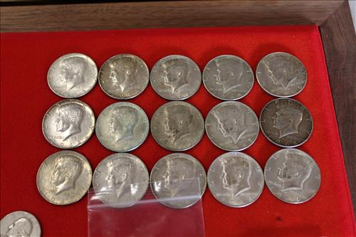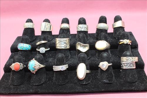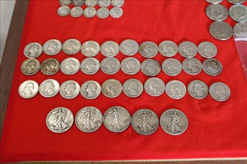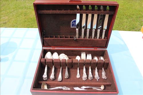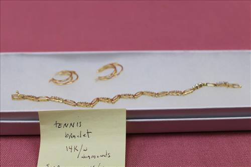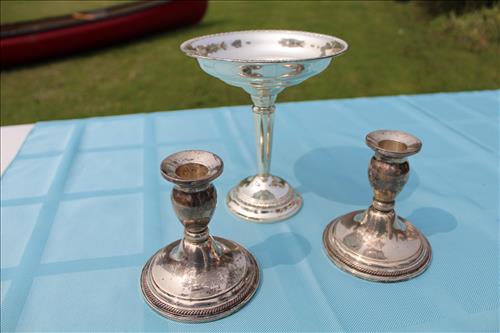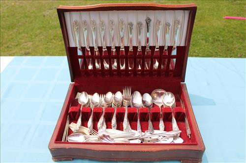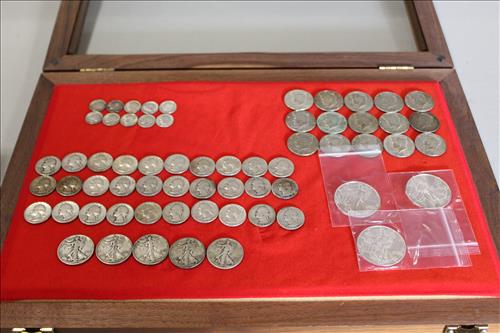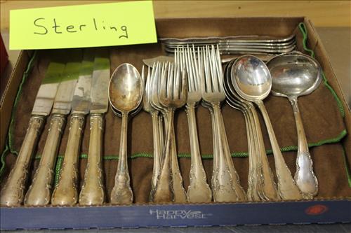 Sterling Silver, Gold, Coins &Jewelry:Sterling Silver: 1895 Flatware Set - Service for 6, Spoons, Misc Flatware Made by Lunt,Weighted Candlestick Holders, Rings & Bracelets;14K Tennis Bracelet w/Diamonds, 14K Earrings w/Diamonds & a 14K Necklace; 18K Size 6.5 Wedding Band,American & Columbus Pocket Watches, Silver Coins: American Silver Eagles: 2001, 2009 & 2022; 40% Silver Kennedy Halves, Walking Liberty Halves, Washington Quarters & Roosevelt Dimes; U.S. Mint Proof Sets: 1991, 2003, 2005 & 2006; Flats of Costume Jewelry, Men's & Women's Watched and Etc......