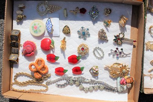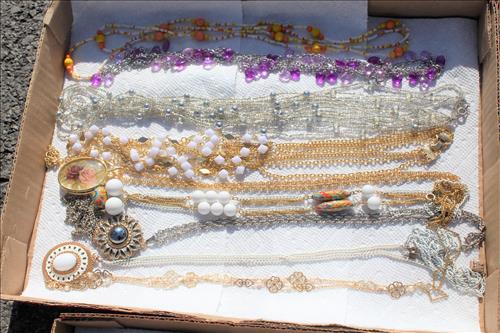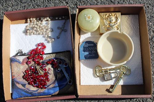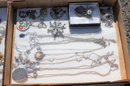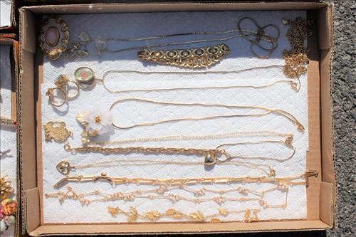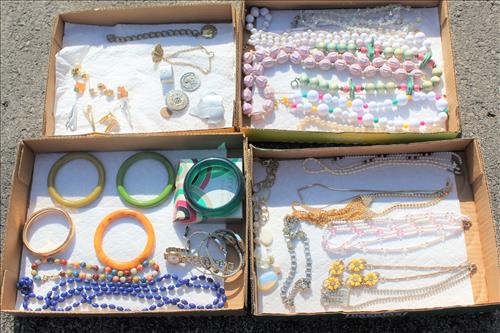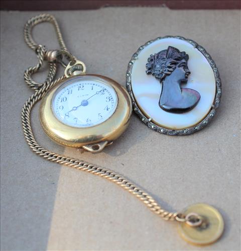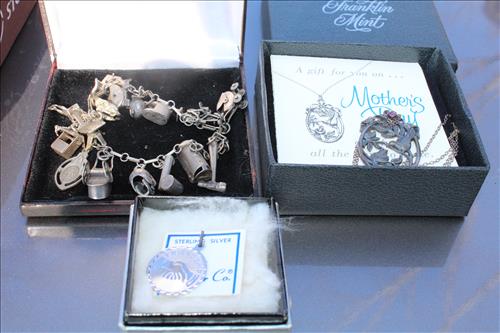 Jewelry:10K Gold Cross & Herringbone Necklace, Sterling Silver Charm Bracelet & Franklin Mint Mother's Day Necklace, Bakelite Bracelets, Elgin Pocket Watch, Rosary Beads & Many Lots of Costume Jewelry.