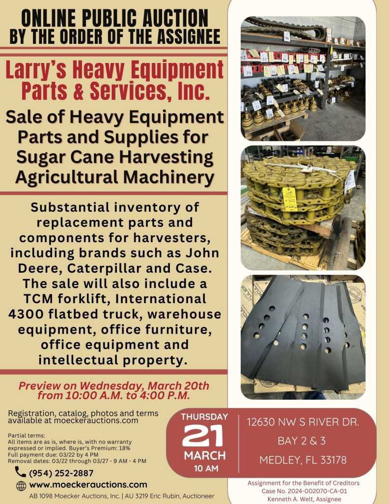 Sale will consist of a vast array of heavy equipment parts and supplies specifically designed for sugar cane harvesting agricultural machinery. This includes a substantial inventory of replacement parts and components for harvesters, including renowned brands such as John Deere, Caterpillar, and Case. The sale will also include a TCM forklift, International 4300 SBA 4X2 flatbed truck, warehouse equipment, office furniture, office equipment and intellectual property (IP).