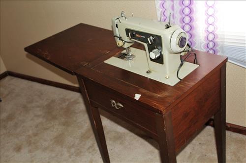 Household Items & Other Misc: Rubbermaid Outdoor Cabinet, Blue Wood Swing, 4 & 6 Drawer Dressers, Wood Armed Wing Back Chair, Small Desk, 6 Chairs and Round Table, 2 Drawer File Cabinet, Drip-O-Lator Coffee Maker, Regulator Clock, Salt & Pepper Collection, Electric Roaster, Turkey Fryer, Gas Cans, Galvanized Oil Can, Waltham & New Haven Wall Clocks, Ceramic Christmas Tree, Kenmore Sewing Machine, Bissell Vacuum, Sharp CD/Cassette Player & More...