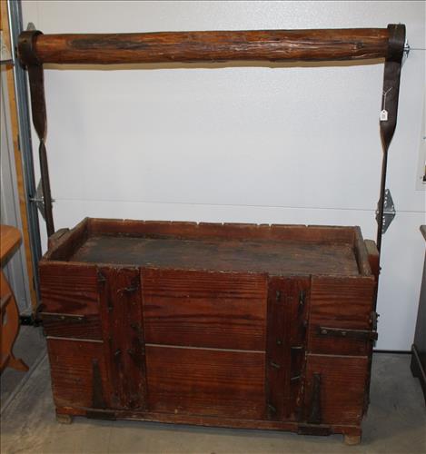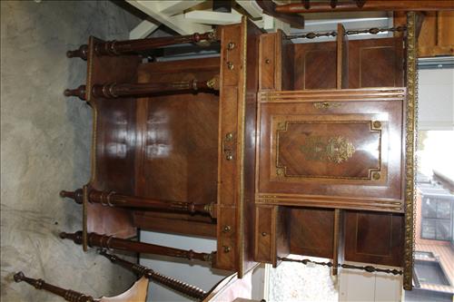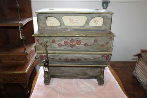 Furniture & Appliances: Outdoor Furniture: Glass Table w/4 Chairs, 3 pc. Rattan Wicker Set & 3 pc Bench Set; French: Oak China Cabinet, Ladies "Bonheur Du Jour" Desk & Buffet; Barcelona Spain Barrel Organ in Working Condition, Oak Turned Leg Claw/Ball Parlor Table, (3) Youth Rockers & Desk Top Chalk Board, Claw Foot Side Stands, Bamboo & 3 Tier Plant Stands, Hand Painted Storage Box, Ice Cream Parlor Stools, Lowry Tartan Coffee Box on Legs, Heavy Metal Umbrella Stand, Tater/Onion Box, 5' X 3" Oriental Style Rug, Haywood Wakefield Lazy Susan Coffee Table & 2 Tier Side Stand, Gate Leg Drop Leaf Table, 4 Drawer Small Buffet, Oak Swivel Top Stand, Marble Top Smoking Stand, Victorian Rocker, (2) Scandinavian Stands, 2 Drawer Sheraton Antique Cherry End Table, White Clad Oak Stand, Industrial Aluminum Chair. Art: Framed Egyptian Prints & Horse/Hunting Theme British Pictures; Appliances: Ke3nmore Chest Freezer & Whirlpool Upright Freezer.