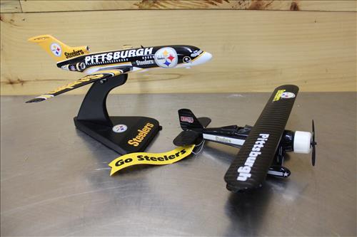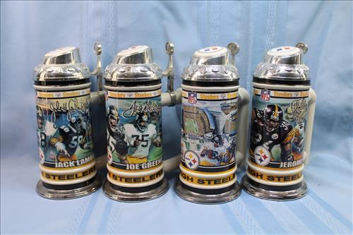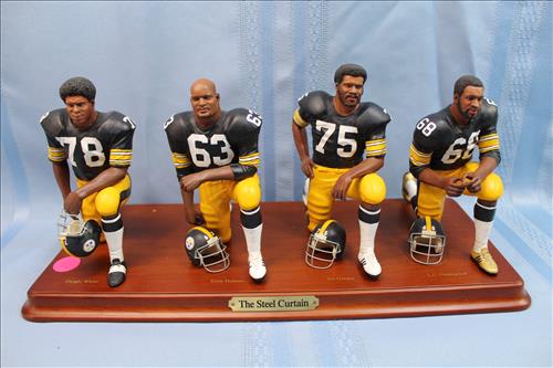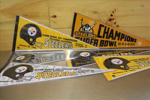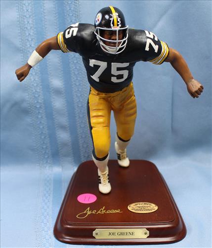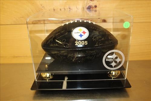 Steelers Collectibles:Danbury Mint: Steel Curtain, Joe Greene, Airplane on Stand, Steeler Train "Holiday Half Time Rail" & "Christmas Express;" Fanatics Hologram Verified Signed Antonio Brown Framed Print, 2005 Signed Football in Case & 2006 Super Bowl XL 40th Anniversary Wilson Football in Case, Limited Edition Hall of Fame Pin Set, Hawthorne Village Train & Christmas Steelers Village Ceramic Town, Bachman Metal Train & Track, (2) Pool Cues, Slag Glass Lamp, Super Bowl XL Topps Card Set, Luggage Tag, Lure, Yoyo, Watch, Key Chain, Galvanized Bucket, Stop Light, Coasters, Candy Cane Ornaments, Beer Glasses, Ertl Airplane & Etc.