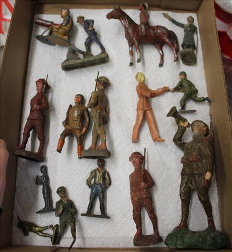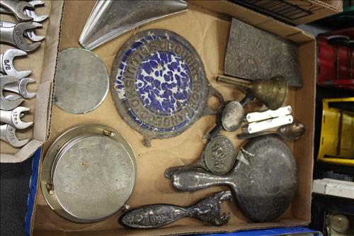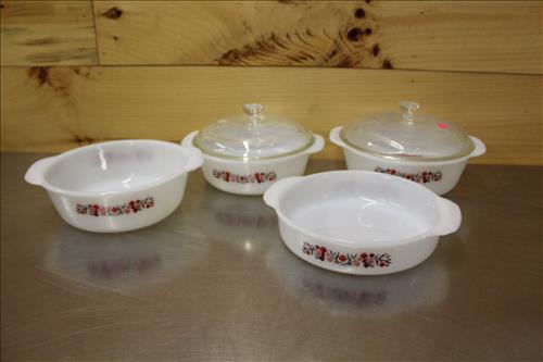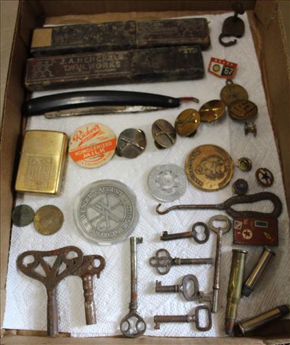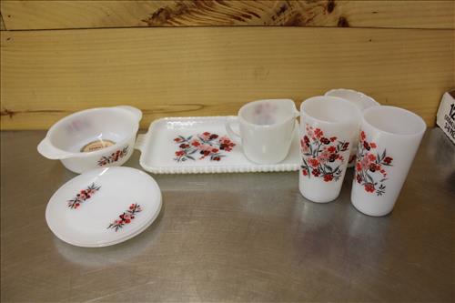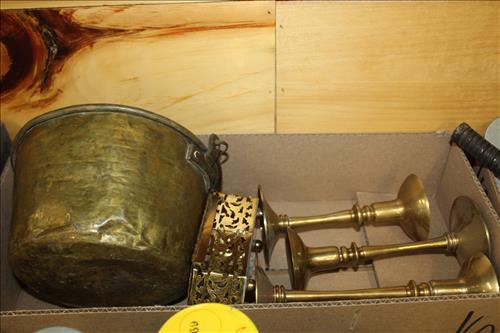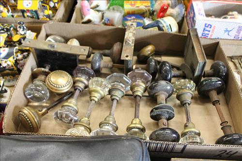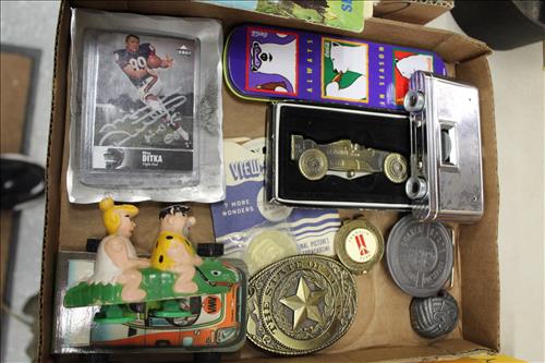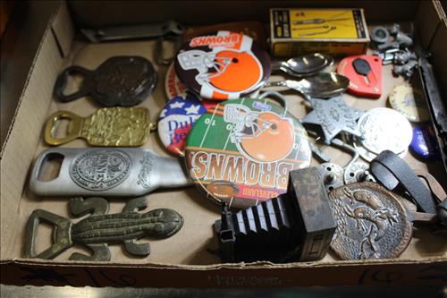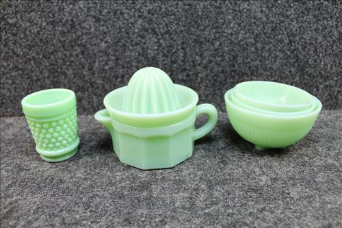 Collectibles & Curiosities: Copper & Brass Fire Extinguishers, Heavy Cast Fireplace Frame & Large Cover, Cast: Drag Race Car & Mechanical Black Americano Banks, Aunt Jemima, Griswold # 9 & Smoke Ring Skillets, Army Figures & 11"Jockey; Brass: Anker Licht Lantern, Mailbox, (2) Baskets, Aviator Bookend, Bucket, Larro Spring Scale, Candle Sticks, Sleigh Bells on Leather; Slag Glass Leaded Lamps: Peacock Blue, Red/Cream, Cream Ornate & Scrolled Shade; Hand Painted Globe Lamp & Scalloped Shade; Jadeite: Cake Plate, Fish Dish, Candy Dish, Swan Dish, Covered Dishes, Reamer, Toothpick Holder, Custard Cups, Shell & Leaf Pattern Candy Dishes, Oil Lamp, Fire King Berry Bowls, NOS 12 Pc. Starter Set & 4 Pc. Place Setting; Opalescent Westmoreland Glass: Footed Vase & Candy Dish, Tall Vase, Crimped Hobnail Fan Vase & Candy Dishes; Herringbone & Iris Bowl & Vase, Iridescent Blue Early American Pattern Punch Bowl w/ (10) Cups & Glass Ladle, L.E. Smith Caramel Slag Glass Covered Turkey Dishes, Pumpkin & Small Pedestal, Lustre Glass Plates, Vase, Bowls & Saucers, Glass Fruit Sets, Pyrex Amish Butter Print& AmericanCinderella Nesting Bowls & Butterfly Gold Covered Casserole & Bowl, License Plates: 1961 Motorcycle, Many 1950-1980, Ohio K 81 D, K 82 D, K 83 D & K 84 D 1957-1974 Plates; Brann's Deer Motif Ashtray, Small Pocketknives, Early Whistles, Sunoco Coins, Stem Punk Glasses, Antique Match Safe, Belt Buckles: Mexican, Marlboro, Coca Cola & Lee; Skeleton Keys, Straight Razors, Zippo Lighters, Army Pins/Buttons, Mechanical Pencils, Cigarette Maker, Bolos, Pistol Bar Mixer, Perma-Made Savings Bank, Murano & Other Paper Weights, Wade Figures, Sleds: Flexible Flyer, Gladding, Speedy & Yankee Clipper; Fire King White Starburst Ramakins & NOS Primrose Baking Dishes, Casseroles, C/S, Glasses & Saucers; Spice of Life Corning Ware, Boyd End of the Day Eye Rinse Glasses, Crackle Glass Pitcher, NOS Early Christmas Charm Bells, Stain Glass Window, Many Banded Batter Bowls, Wood Bowls, Yellow Ware & McCoy Bowls, Cookie Jars: W.C. Fields, 1940 Winking Bellmont Lion, 1940 Turnabout McCoy, American Bisque Pig, Dutch Girl/Boy, Wagon/Donkey, Cookie Truck, Dog w/ Rifle, & Coca Cola; Cookie Cutters, Mold Plane, Many Newer/Older Quilts, Ruby Red Pot Belly Pitchers, Rolling Pins, Shenango China Sets, Silverplate Tilting Beverage Holder, Marble Banjo Shaped Clock, (2) Cuckoo Clocks, NOS Danbury Mint 1953 Cadillac Eldorado, Superior Sanitary Churn, Crock Jug, Salt Glazed Salt/ Butter Holders, Enamel Ware, Campbell Pottery Pitcher/Vase, Glass, Ceramic & Brass Door Knobs, Large Beakers, Chevy Aviator Hood Ornament, Large Collection of Farber Amethyst Art Deco Glass on Chrome, Goebel Small Winter Figurines, Hand Pained Nippon Dresser Set, 1971 "Archie" Glasses, G. Ruggeri Olympian Disk Thrower Statue, McCoy Brushed/Glazed Pottery, Sonora Radio, German Silver Chain Evening Bag, Mother of Pearl Opera Glasses,Firkin Bucket,Interesting Metal Car Show Tags, Creek Chub Bait Co Lure in Original Box, Fishing Lures, Bottle Openers & Much More.