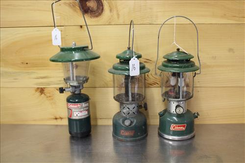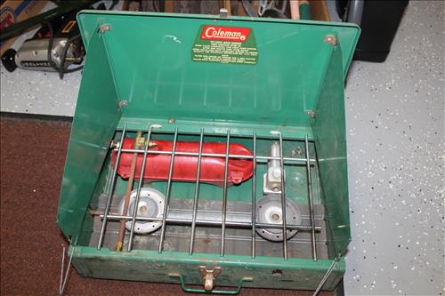 Household & Misc: Coleman & Igloo Coolers, Coleman Lanterns & 2 Burner Stove, Griswold 3 Burner Cast Stove & Step Stool, New Wolfgang Puck Grilling/Baking Station, Floor Fans, Mixing Bowls, Linens/Towels, Grove City College Throws, Lamps: Coffee Grinder Mill, Glass & Pottery; (6) Industrial Metal Filing Cabinets, Wood, Ceramic & Metal Roosters, Wendall August Forge: Bronze Clock, Napkin Holder, Candle, Pencil Cup, Coasters & Military Plate; Longaberger Baskets, Vera Bradley Purses, Cookbooks, B/D Coffee Maker, Many Hub Caps, Foam Archery Target, Scout Bow/Arrow, Large Bag Full of Bauer Hockey Equipment, Armstrong Flute in Case, Decanters, Pore Humidifier, Flash Light, Fishing Reels, Spongeware, 50+ Hallmark Ornaments, Green Indiana Glass, Fire Alarm Pulls, Juke Box Radio/Cassette Player, Wood Oar, Butter Churn & Much More.