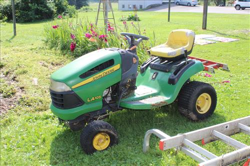 Equipment & Tools:Riding Mowers:John Deere LA 105& Craftsman 21 hp w/ 42" Deck; Central Hydraulic Motorcycle Lift,Craftsman: Tiller, 16" Chainsaw, Lever w/ Laser Trac, Tool Box on Wheels, 100 Watt Generator, 12 gal. Shop Vac, Router, Ratchet, Socket Set, Belt Sander,16 gal.Shop Vac; Mac: Large Tool Box MB1100 on Wheels, STP 100 Balancer Puller Set, Ratchet Set, Mini Metal Box, Socket Sets & Punch Set; Snap On: Wrench Set, Bushing Driver Set, Ratcheting Box Wrenches, Crescant Wrenches; S&K: Open End Wrenches, Deep Socket Set & Small Socket Set; Riverside Air Compressor, 2.5 Ton Floor Jack, Campbell Hausfeld Air Compressor, Chainsaws: Pouland 18" & Vtg Homelite, Lumber Roller Stands, Sears 1250 Alternator Power Source, C - Clamps, Ryobi 12" Chop Saw, Jack Stands, Vulcan 10 Drawer Large Tool Box, Torque Wrenches: Proto, S&K, Pgh Pro & Vtg. Snap On; Metal Car Ramps, Plumbing Snake, Ladders: Werner24' Aluminum, 20' Fiberglass & Wood Step; Remington Pole Saw, Power Craft Bench Grinder, Mechanics Rolling Stool, Black/Decker Hammer Drill, 6 Vintage Air Tools, Tap & Die Set, 1878 Chenby Anvil #20, Rigid Pipe Wrench & Cutter, Large Crescent Wrenches, Performance Tool O Ring Set/Pliers, Chrom-Vanadium Open End Wrench Set, Dewalt 12" Saw Blades, Drill Bits, Vice Grips, Welder's Helmets, Reese Hitches & Balls, Garden/Hand Tools, Vehicle Side Mirrors, Multiple Style Gauges, Tachometer, Watt Meter & More Teste4rs, Files & Rasps, Agway Seeder, Misc. Hardware, Wire, Motor Oil Lots, Glove Lots, Car Mechanics Manuals, Vtg Table Saw w/ Large Motor, Skilsaw 3310 Table Saw, Plumbing & Painting Supplies, Assorted Lumber & More.