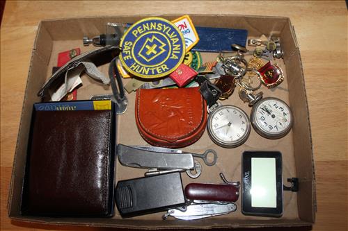 Antiques & Collectibles:Few Silver Coins: 1891 O Morgan Silver Dollar, 3 Franklin Halves,2 Mercury Dimes, 2 Wartime Nickles & Wheat Pennies; Costume Jewelry & Pocket Watches,Knives: 119 Buck Knife & Case & 2 Blade Queen Steel #39, Asbach-Uralt German Wrought Iron Swing Bottle Dispenser, Large Porcelain Piggy Bank, Griswold #8 Skillet, Early Fisher Price Toys, Zippo Lighter, Champion Marbles, Duncan Yo-Yo, US Army Canteen & Bullet Holder, Large Quaker State Advertising Can, Wendall August Forge: Giving Plate, Pittsburgh Point Scene, Coasters, Ornaments & Horse Key Chain; Wood Clogs, Advertising Hats, Hallmark Ornaments, 1972 Carl Yastrzemski Baseball Card, Terry Labont Race Car Toy Hauler Truck, Master Crafters Sailboat Clock, Prince Lighters, Bolo, National Defense Medal, Jason & Bushnell Binoculars, Skeleton Keys, Misc. Patches & Baseball Cards, Novelty Knives, Blazout Fire Extinguisher, Early After Shave/Cologne Bottles, Leather Suede Whip, Leather Belts & Belt Buckles, HO Scale Trains, Ceramic Kissing Dutch Boy/Girl, Army Duffle Bag, Pins & Buttons, Small Wood Ship Wheel Clock, Oil Lamps, Nascar: Flags, Kelloggs Cardboard Cut Out Stand Up, Many Advertising Cast Cars, Magazines, Books, Autographs, Checkers, Hats, Posters, Mugs, Pillows, Dave Allison Clock Plaque, Binders Full of Pro Set, Maxx & Traks Collector Cards, Jackets L & XL & More.