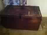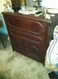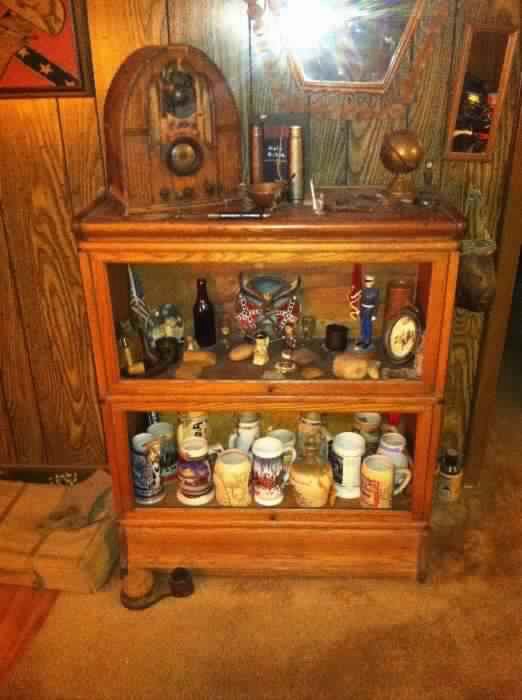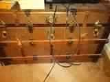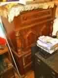 ANTIQUE FURNITURE: Fine Mahogany ca. 1820 Primitive raised panel 4-door Corner Cabinet, Walnut small sewing rocker, Mahogany pattern-back Spindle Rocker, Pine and Glass window display table, 2 section Oak Barrister Bookcase size “D” with top and bottom, Golden Oak Empire Revival Bookcase, Mission Oak single pedestal Dining Table, 4 Pine antique Oak seat ladder-back chairs, 4 Post Ornate Crest Federal style Colonial Revival double bed, Oak Pattern-back tall rocker, Empire Victorian Lift top flame mahogany Washstand, Old Pine Carpenters Chest with hand-forged hasps, Old antique flattop metal and wood trunk, Victorian Racetrack pattern Chestnut Butler’s 3-drawer chest, Oak 3-drawer Antique Hoosier cabinet with enamel top, Oak antiqued painted Pie safe with green crest & drawer. US ARMY Issue Field Desk with tableBase, 750th PSC, Several Old Pine Benches.