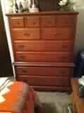 CONTEMPORARY FURNITURE: Iron and wicker side table, 3 stools, Bamboo settee, Chair, 2 tables, Pine double bed with bookcase headboard, Maple 6-drawer Chest United NC Furn, Modern Cheval Mirror, Pair Mediterranean Lamp tables, Nightstand, and Gentleman’s chest, TV stand, Entertainments center. Rattan trunk, Maple Early American Dry Sink.