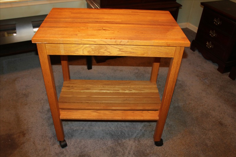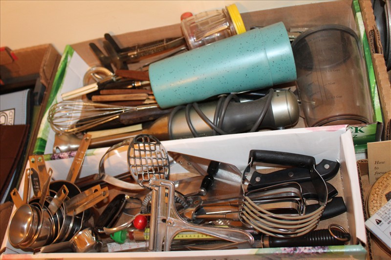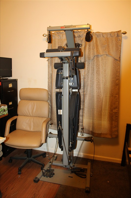 Household, Furniture & Misc: Coffee Table & 2 End Stands W/ Glass Inserts, MCM Glass Display Cabinet, Wheeled Butcher Block Island Cart, Marble Topped Kitchen Island, Tan Office Chair, 4 Drawer Metal File Cabinet, Day Bed, Kitchen Table W/ Leafs & 4 Chairs, American Drew Inc Dresser Set: 9 Drawer Chest w/ Mirror, 2 Night Stands, 3 Over 6 Drawer Dresser; Nordic Track Electronic Treadmill, Small Coleman Tent & Camping Set, Cleaning Products, Light Bulbs, Linens, Kitchen Utensils, Bissell Little Green Spot Cleaner, Bowflex Workout Machine, Oreck Floor Steamer, Whirlpool Gas Stove, Crock Pot, VisionWare, Comfort Adirondack, Step Stool Seat, Gas Cans, Window Air Conditioners, Renpho Foot Massager, & Yard Tools.