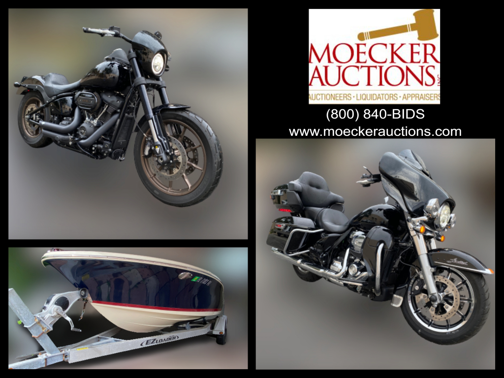 Sale will consist of: 2020 Harley-Davidson FXLRS Low Rider S Motorcycle, Odometer reading: 2,242; 2018 Harley-Davidson Electra Glide Limited Motorcycle, Odometer reading: 2,106; 2013 Chris Craft 20 Launch Bow Rider (20′ Stern Drive Boat), Engine: Mercury Mercruiser 5.0L MPI, Hours: 166, Out-Drive Unit: Mercury Mercruiser Bravo 3, Dual S/S Three Blade Mercury Bravo 3 Props w/2013 EZ-Loader Tandem Axle Trailer, Model TAB 18-21 4000