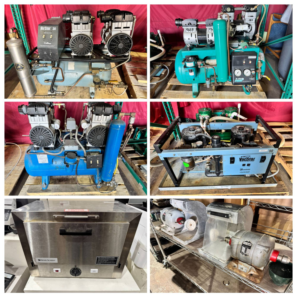 Rayscan Dental X-ray System RBS-A01, Soredex Cranex Novus Panoramic X-ray CRA-1 Manufactured: November 2010, Air Techniques AirStar 30 Dental Air System, CAT: 302085, 150 PSI, 11.8 Gallon, Freedom Line Air Systems Air Compressor Unit, Model: LT-6D, S/N: 2880943, 125 PSI, 15 Gallon, Air purifiers, oral care supplies, office chairs, exam room stools, X-ray vests, Tuttnauer autoclaves, mini refrigerator, cleaning supplies, printers, shredders, TVs, fans, and more.