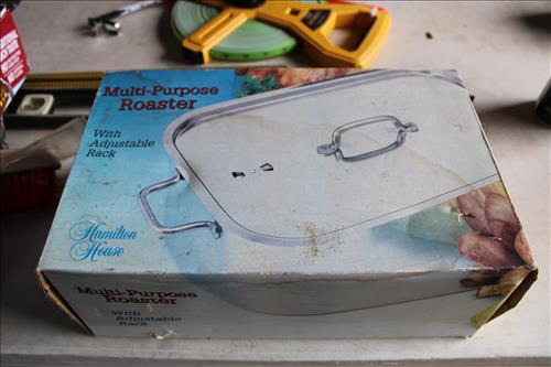 Household & Misc:Appliances: Frigidaire Top Freezer Fridge, Small - Electric Food Slicer, Microwave, Crock Pots, Bread Maker, Rival Ice Cream Maker & Hamilton Beach Roaster; Lasco Heater, Fans, Window AC Units, it Innovative Technology Wood Music Center, Pyrex Portables, Flash Lights, NIB Night Blaster 3,000,000 & Ozark Trail Floating Lantern, Sears Kerosene Heater, Many Dozen Canning Jars, Yard Bears, Fishing Poles: South Bend, Bruin, Zepco & Schemano; Games, Puzzles, Books, Cleaners, Light Bulbs, Wood: Bulldozer, Truck, Child's Chair & Truck Planter, Costume Jewelry Lots, Cherry Plank Boards, Eagle 27500 Fish/Depth Finder, Galvanized Tubs, Pots & Pans, Multipurpose Roaster, 55 Gal Metal Barrel Drums, Coleman Gas Smoker/Grill, Handmade Wood Carriage Cart, Turkey Fryer w/2 Propane Tanks & A LOT MORE.
